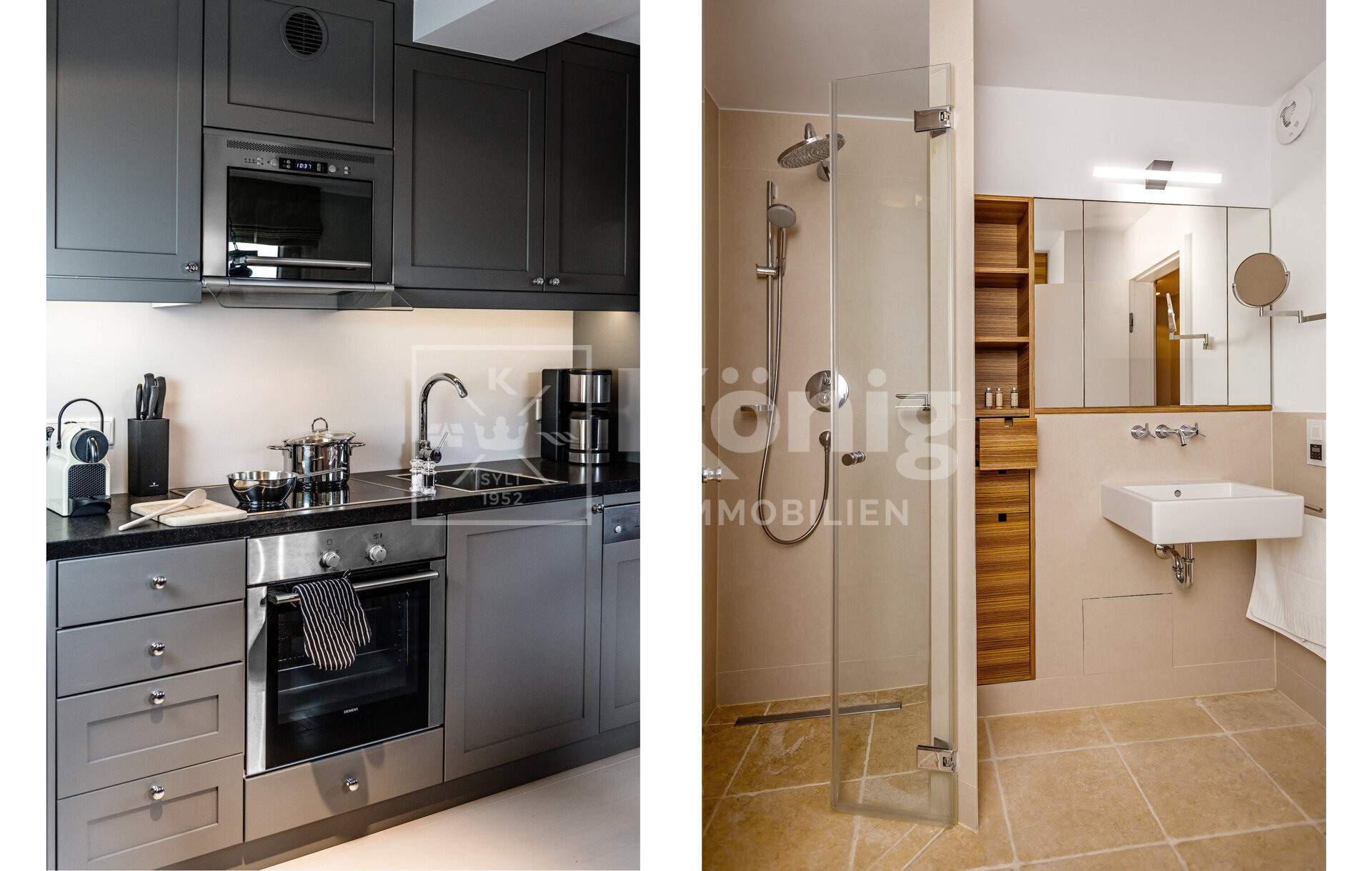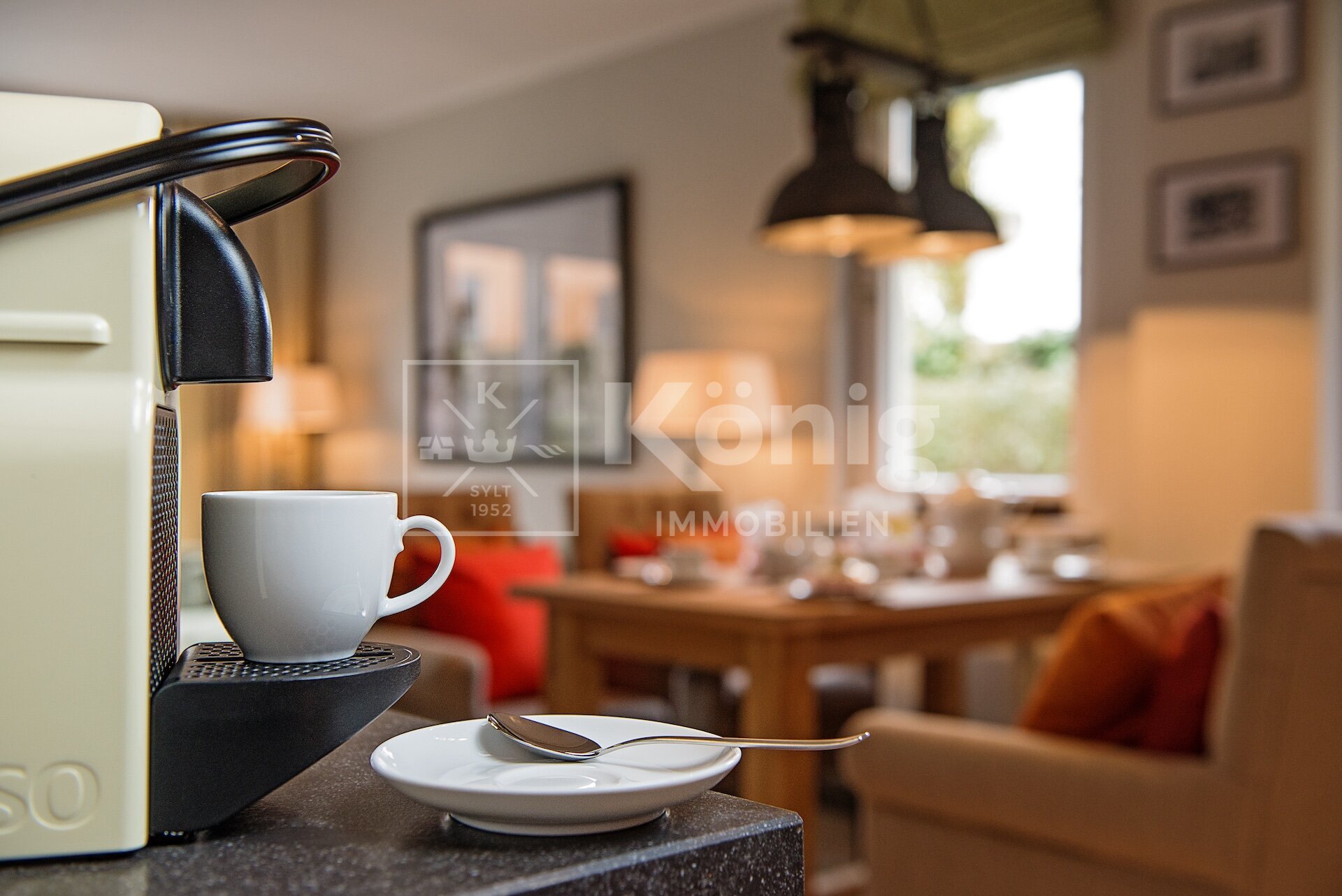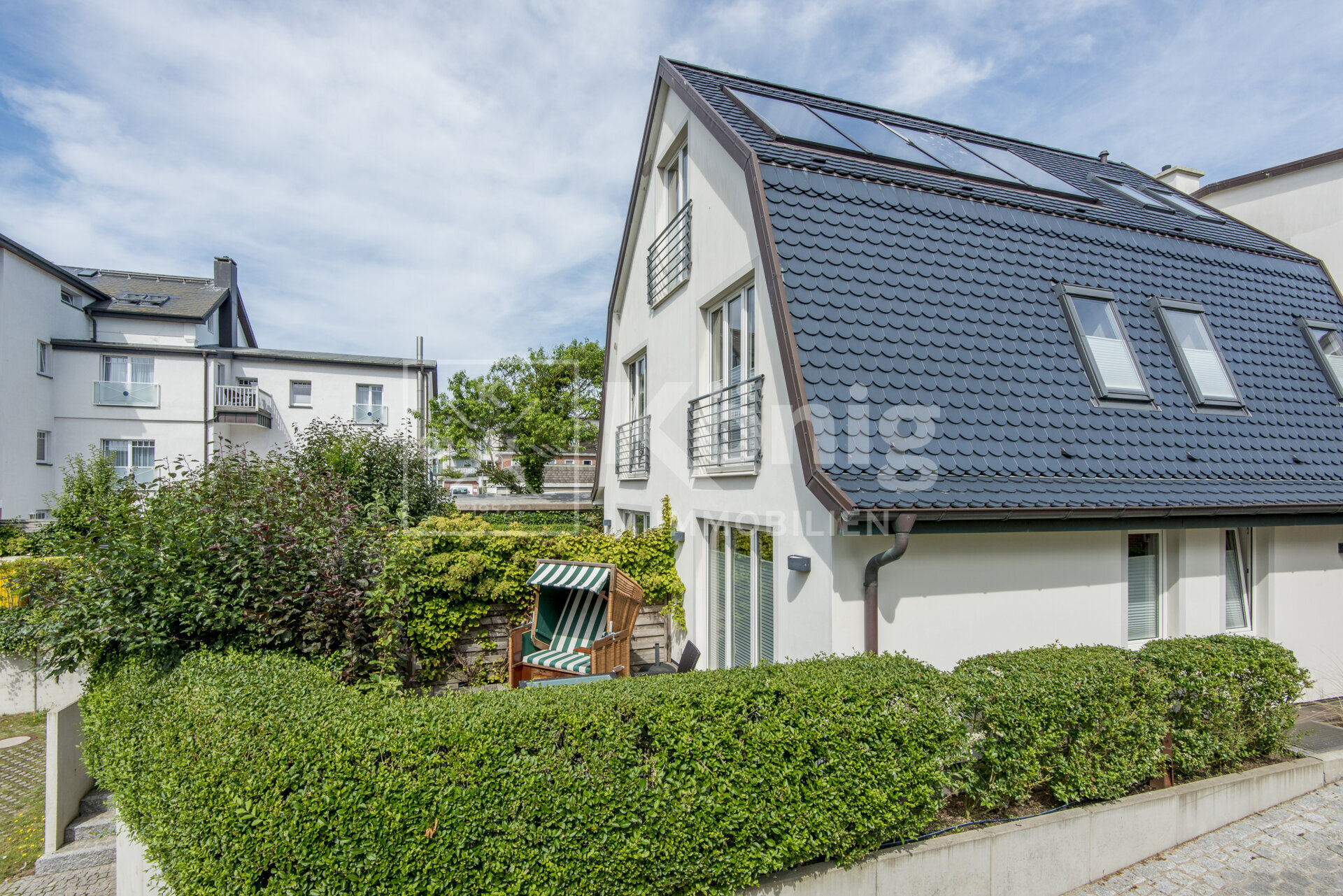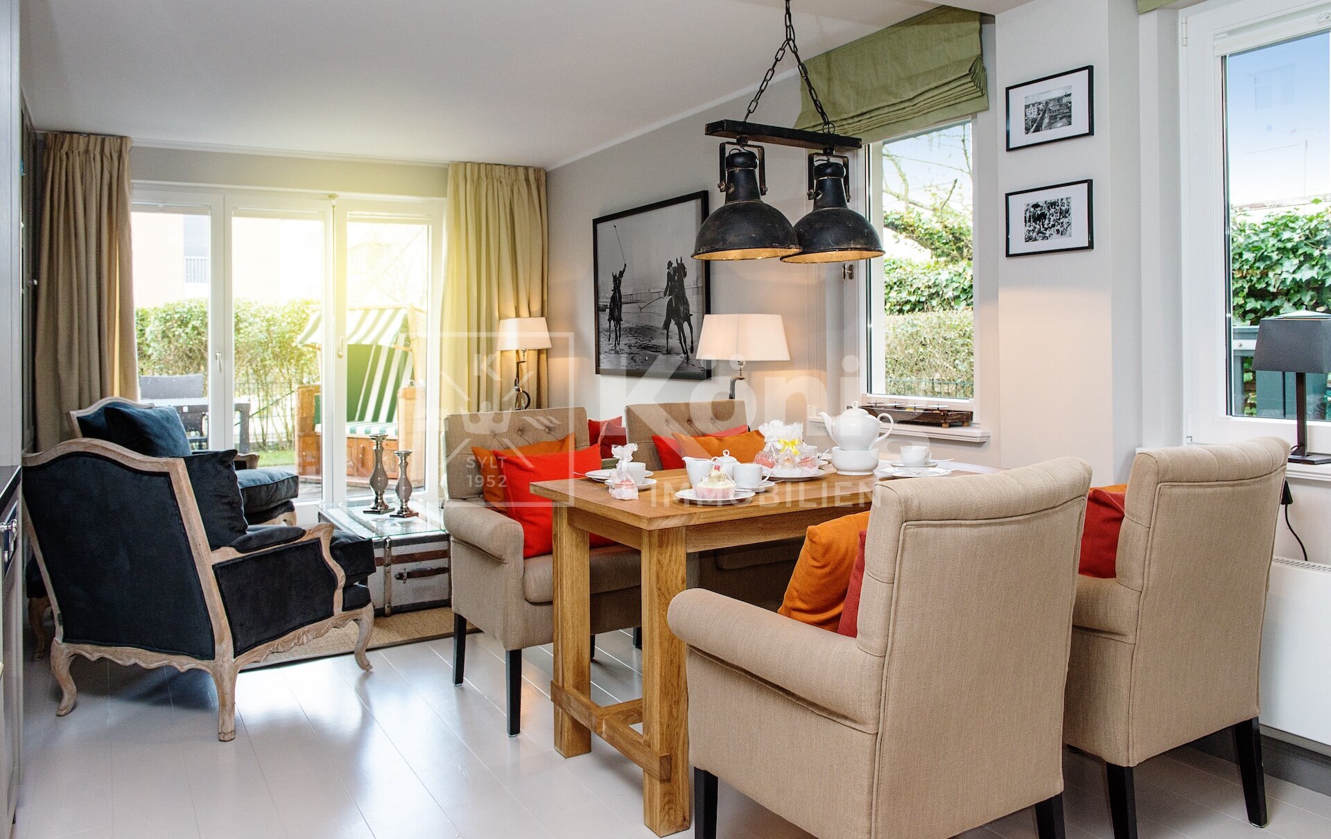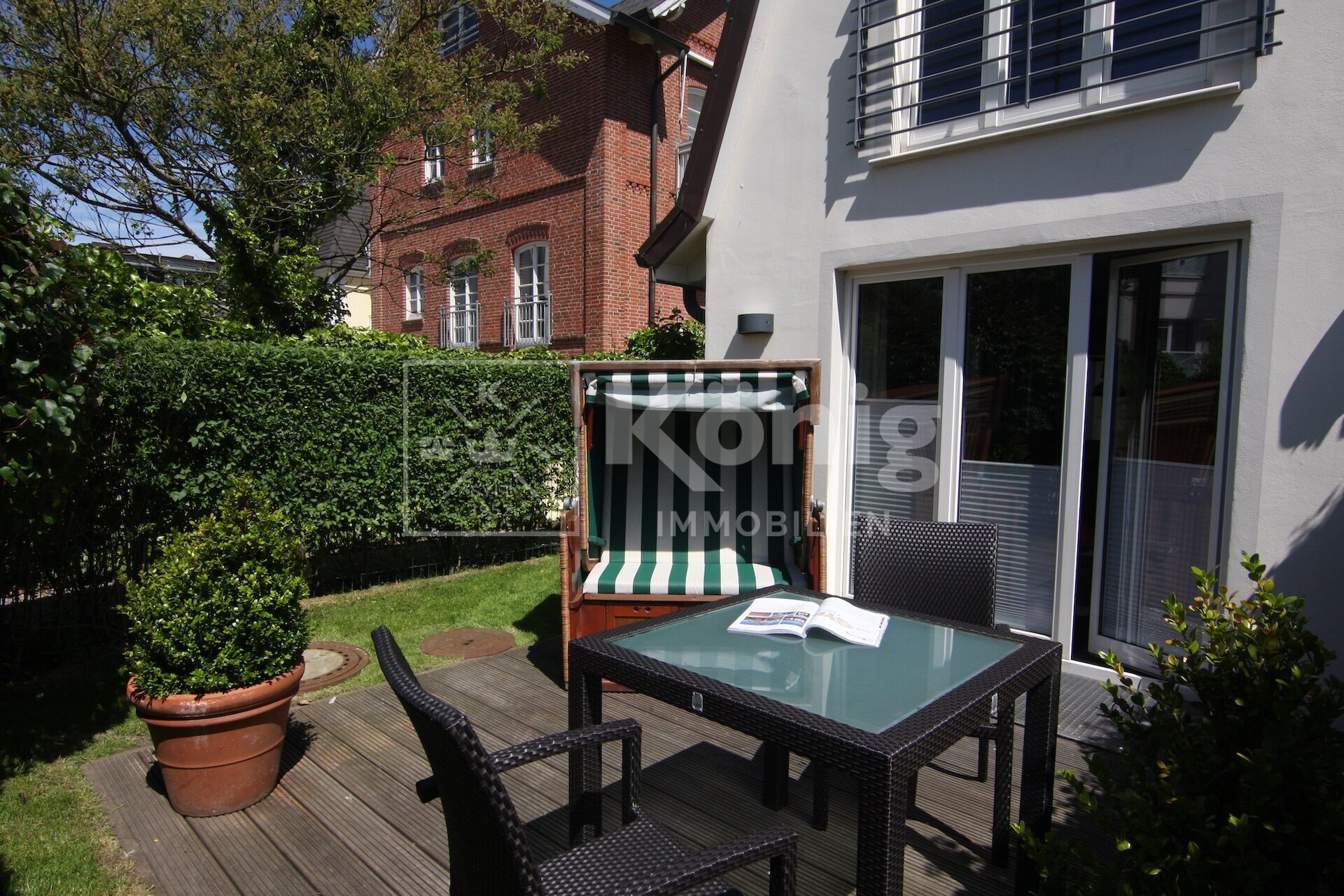 Die offene Küche schafft Verbindung zwischen Kochen, Genießen und Ankommen. Der Freisitz erweitert den Wohnraum ins Draußen – ein Ort für Kaffeepausen, Lesemomente oder stille Sonnenuntergänge nach einem Tag am Strand oder einem Bummel durch die nahegelegene Friedrichstraße.