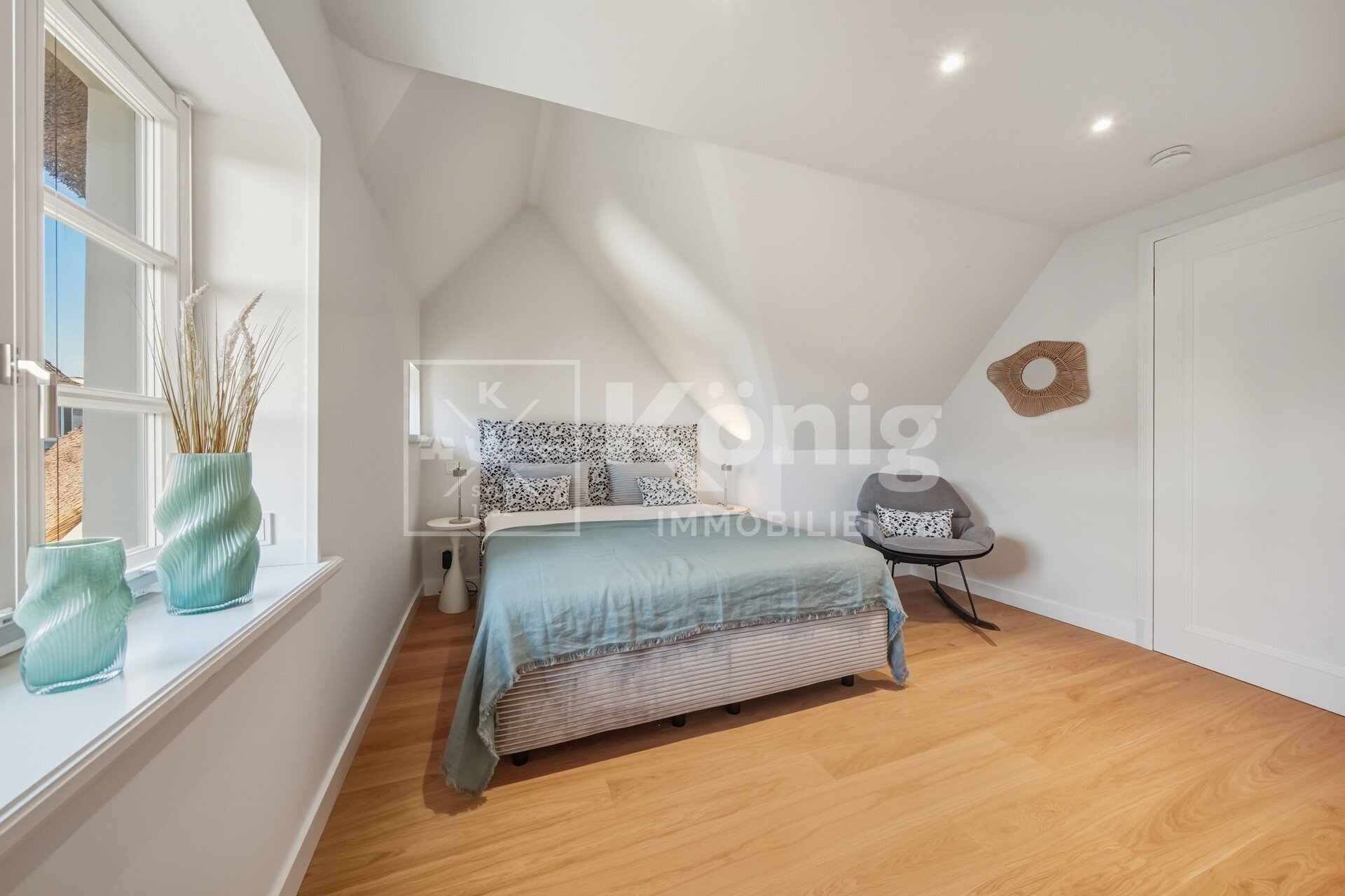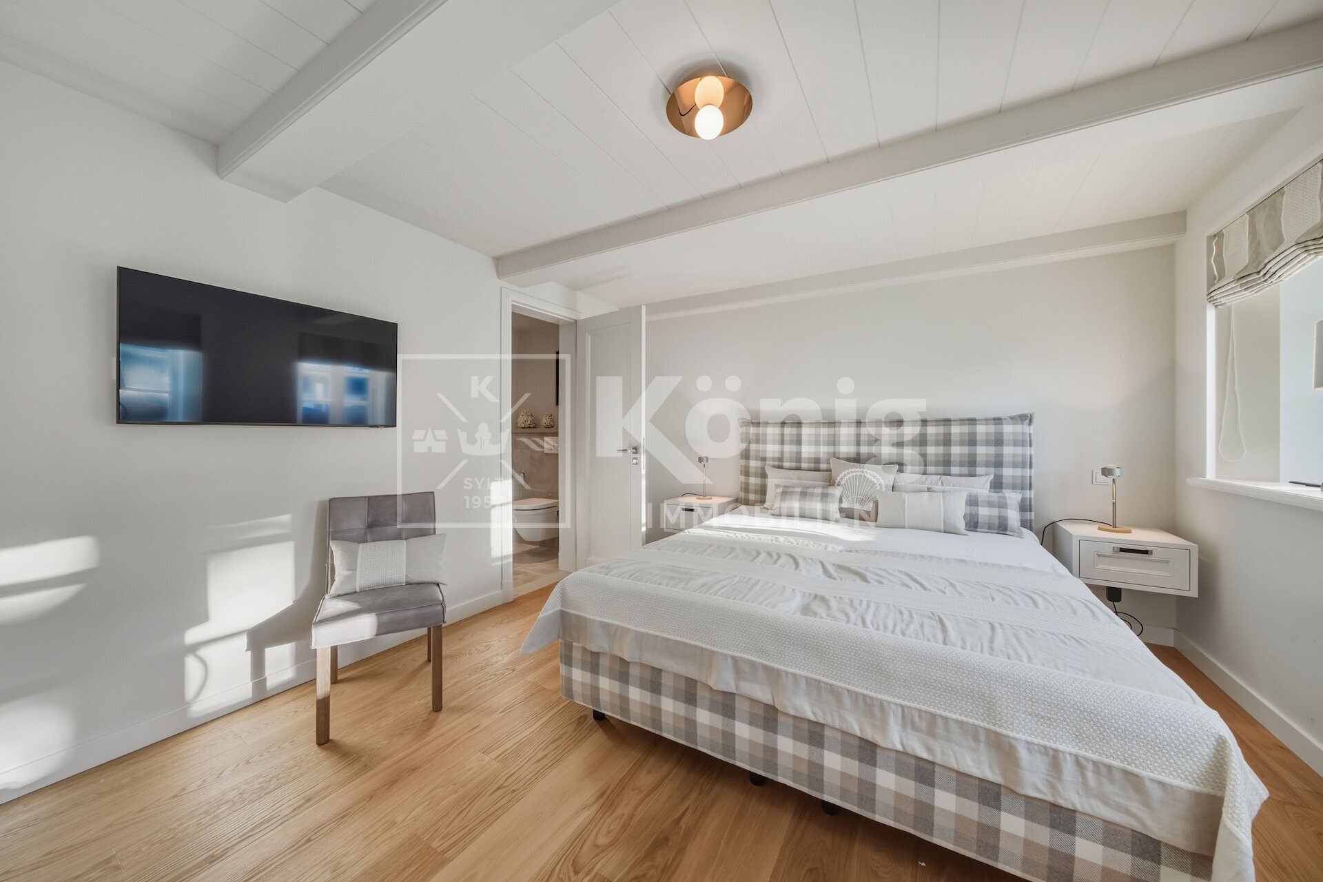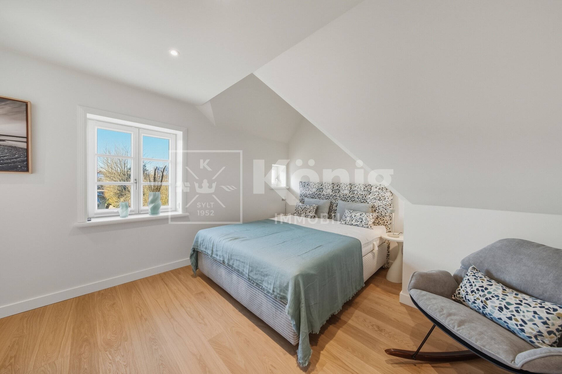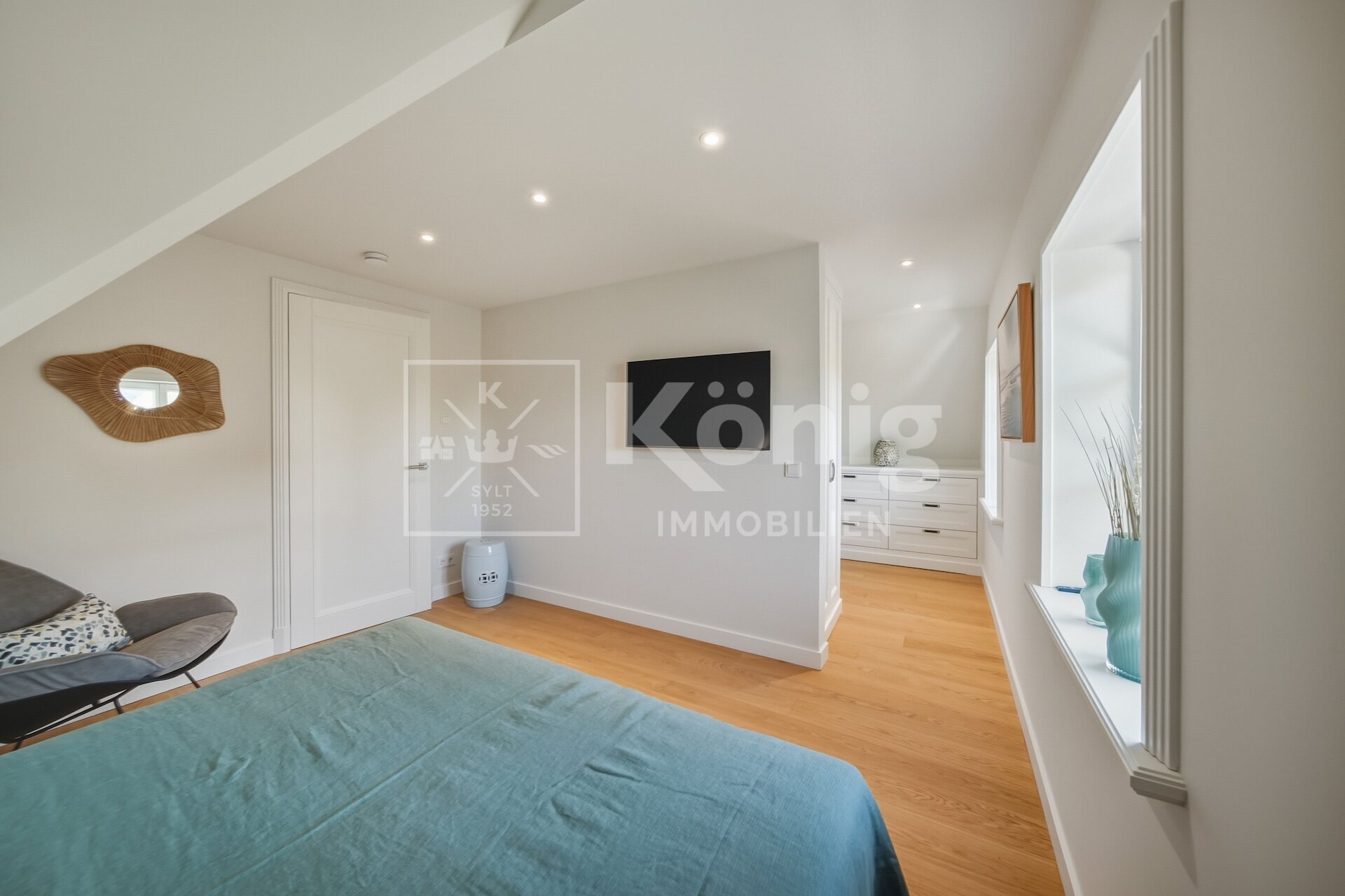 Eine durchdachte Raumaufteilung bietet insgesamt fünf Zimmer, darunter drei stilvolle Schlafzimmer und drei moderne, hochwertig ausgestattete Badezimmer. Ein besonderes Highlight ist das Schlafzimmer mit Bad en Suite im Erdgeschoss, das höchsten Komfort garantiert und bequem begehbar ist. Altersgerechtes und bequemes Wohnen auf einer Ebene ist hier möglich, dies ist auf Sylt nur sehr selten zu finden.