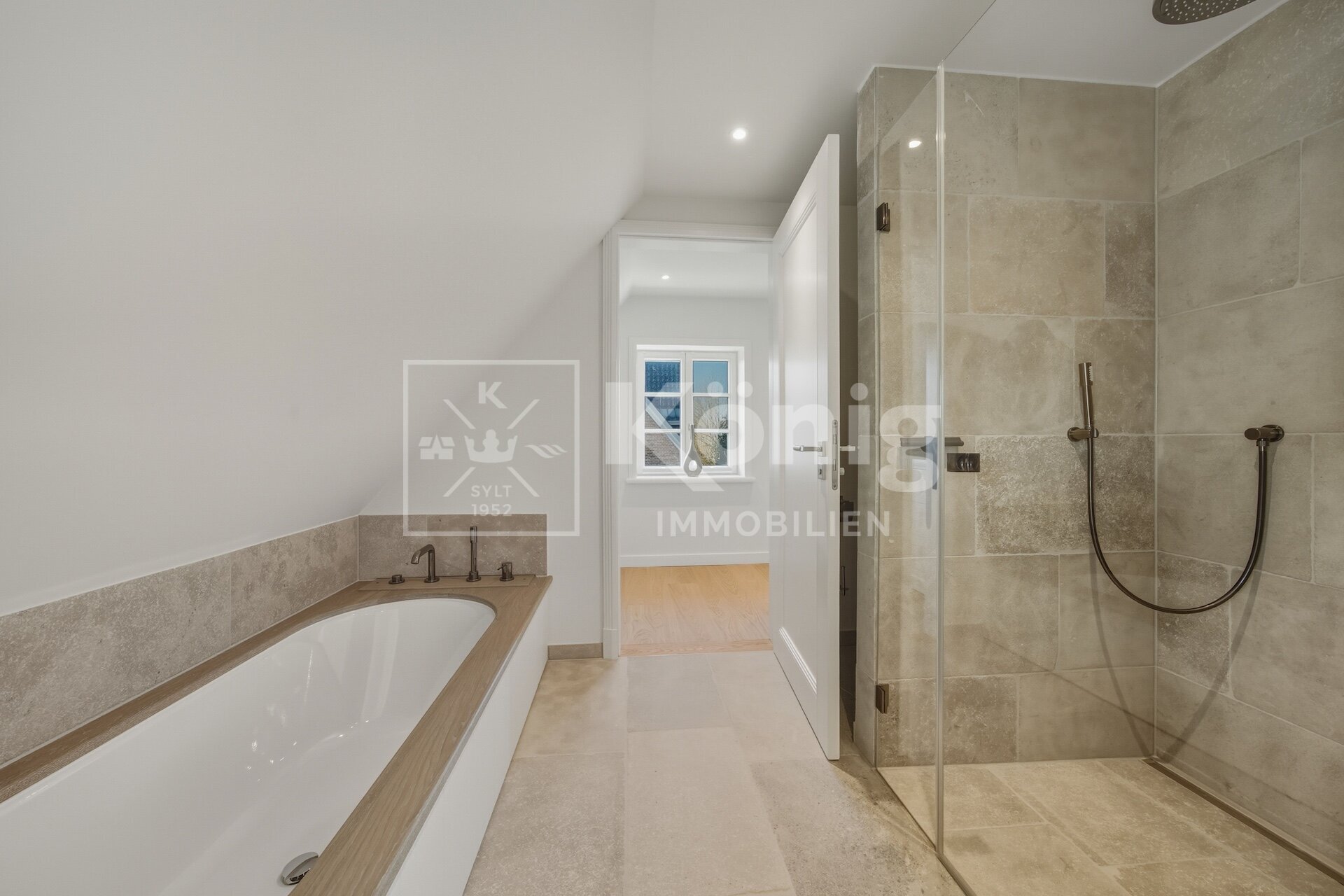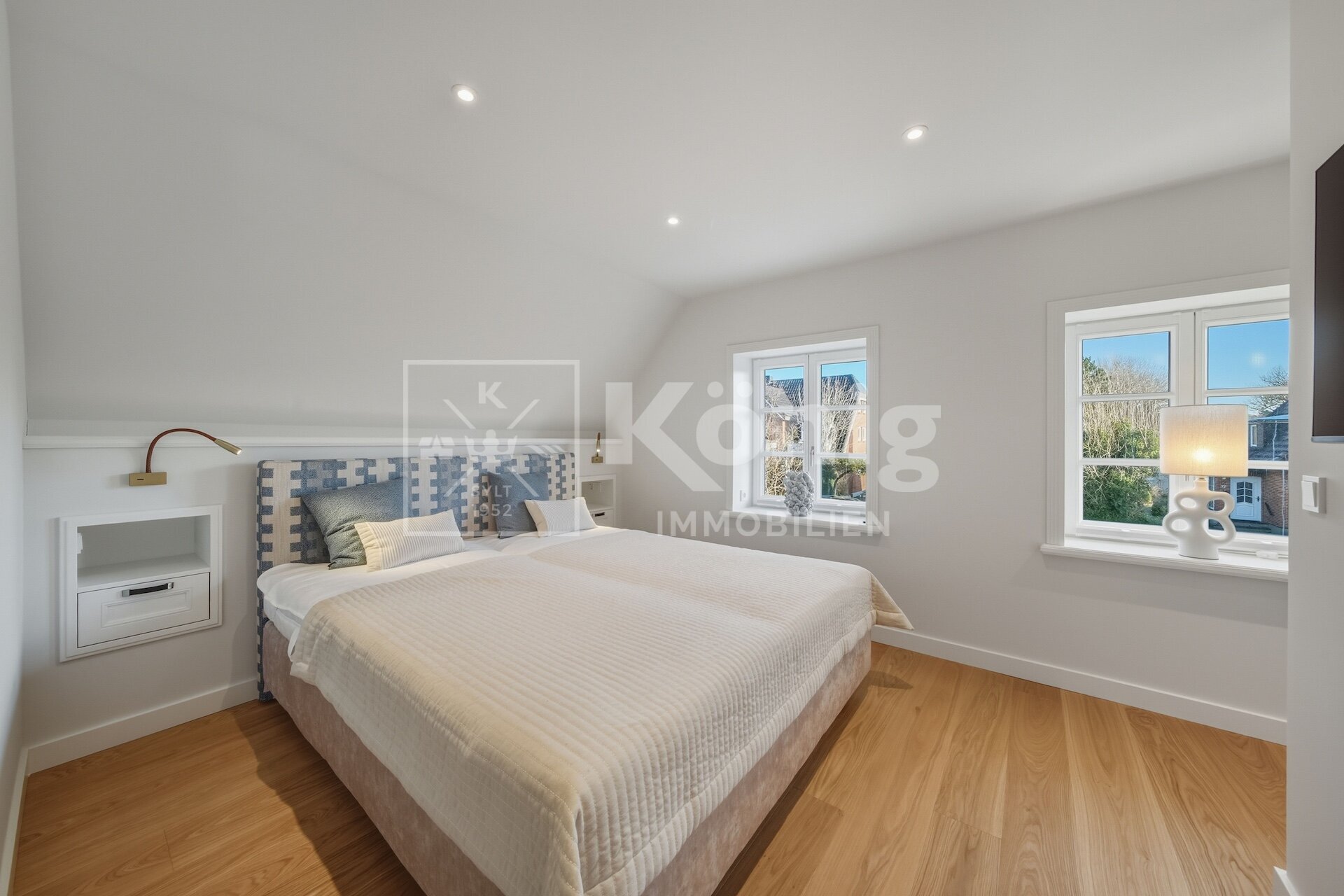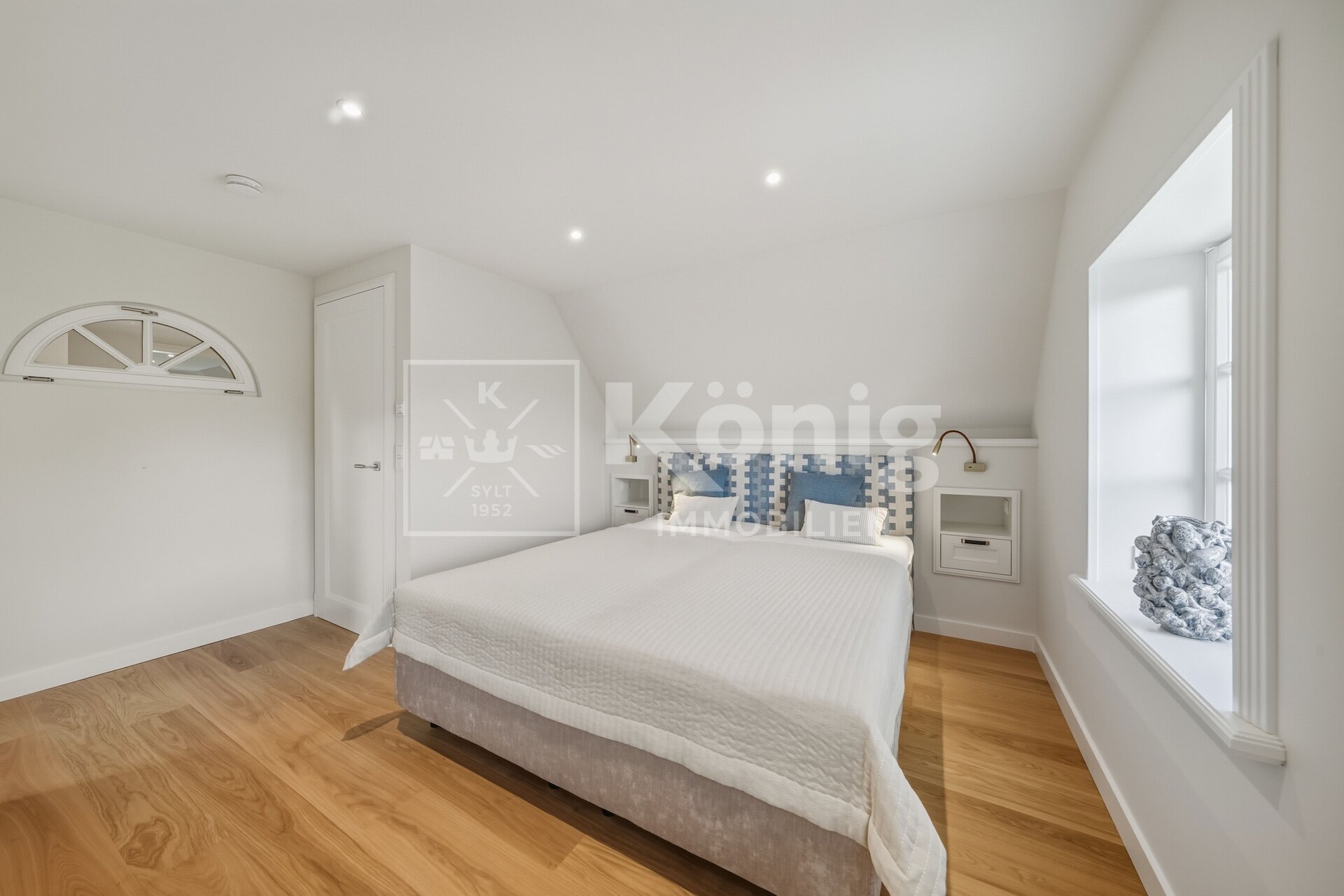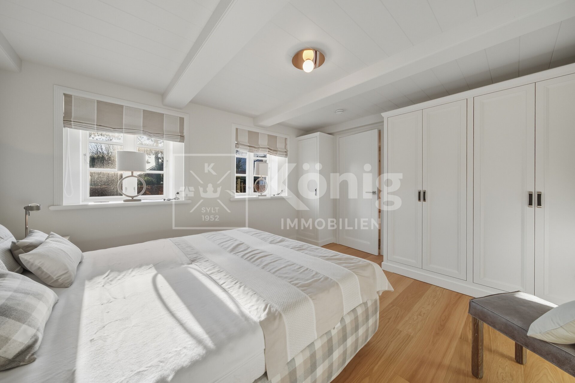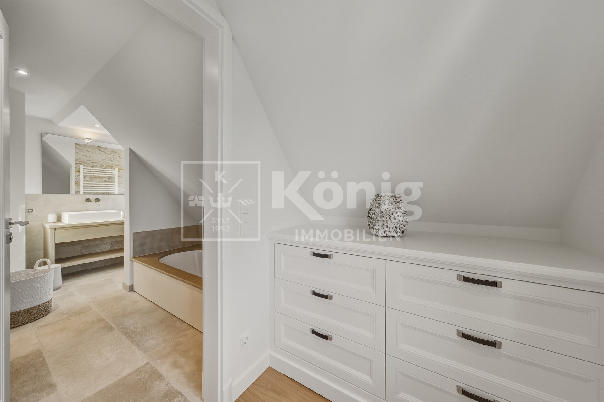 Eine durchdachte Raumaufteilung bietet insgesamt fünf Zimmer, darunter drei stilvolle Schlafzimmer und drei moderne, hochwertig ausgestattete Badezimmer. Ein besonderes Highlight ist das Schlafzimmer mit Bad en Suite im Erdgeschoss, das höchsten Komfort garantiert und bequem begehbar ist. Altersgerechtes und bequemes Wohnen auf einer Ebene ist hier möglich, dies ist auf Sylt nur sehr selten zu finden.