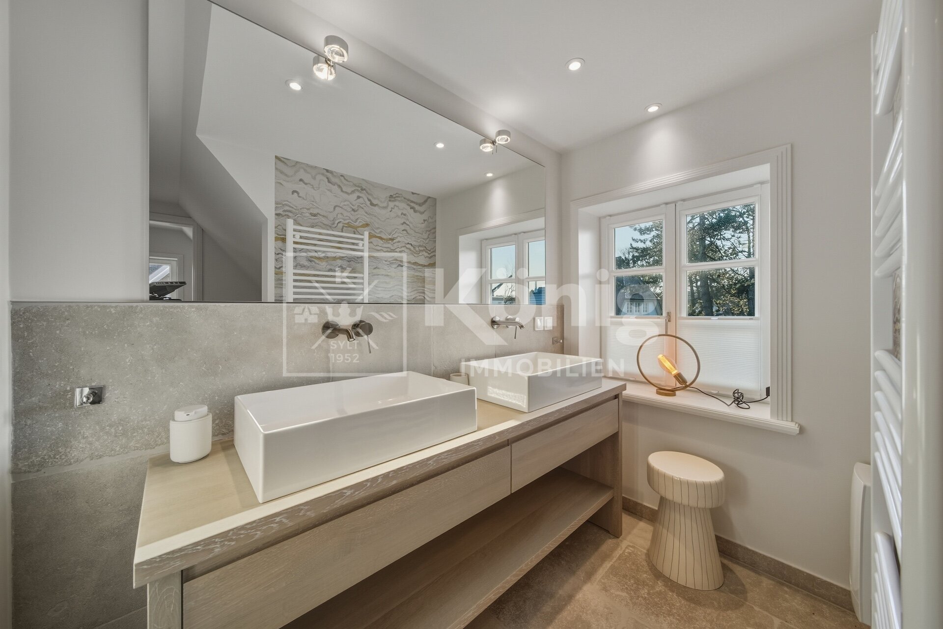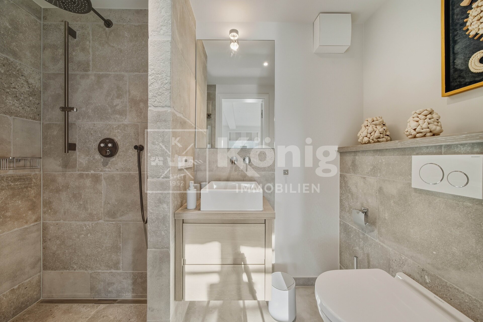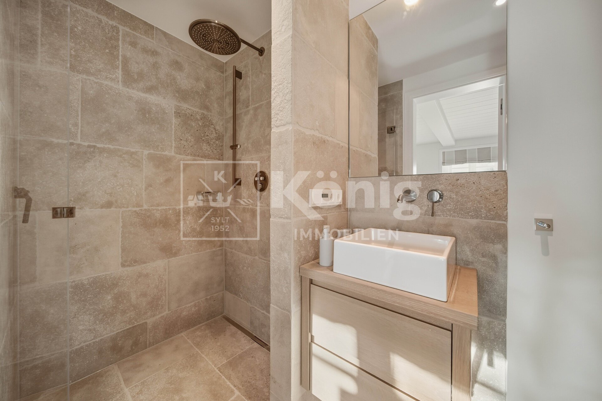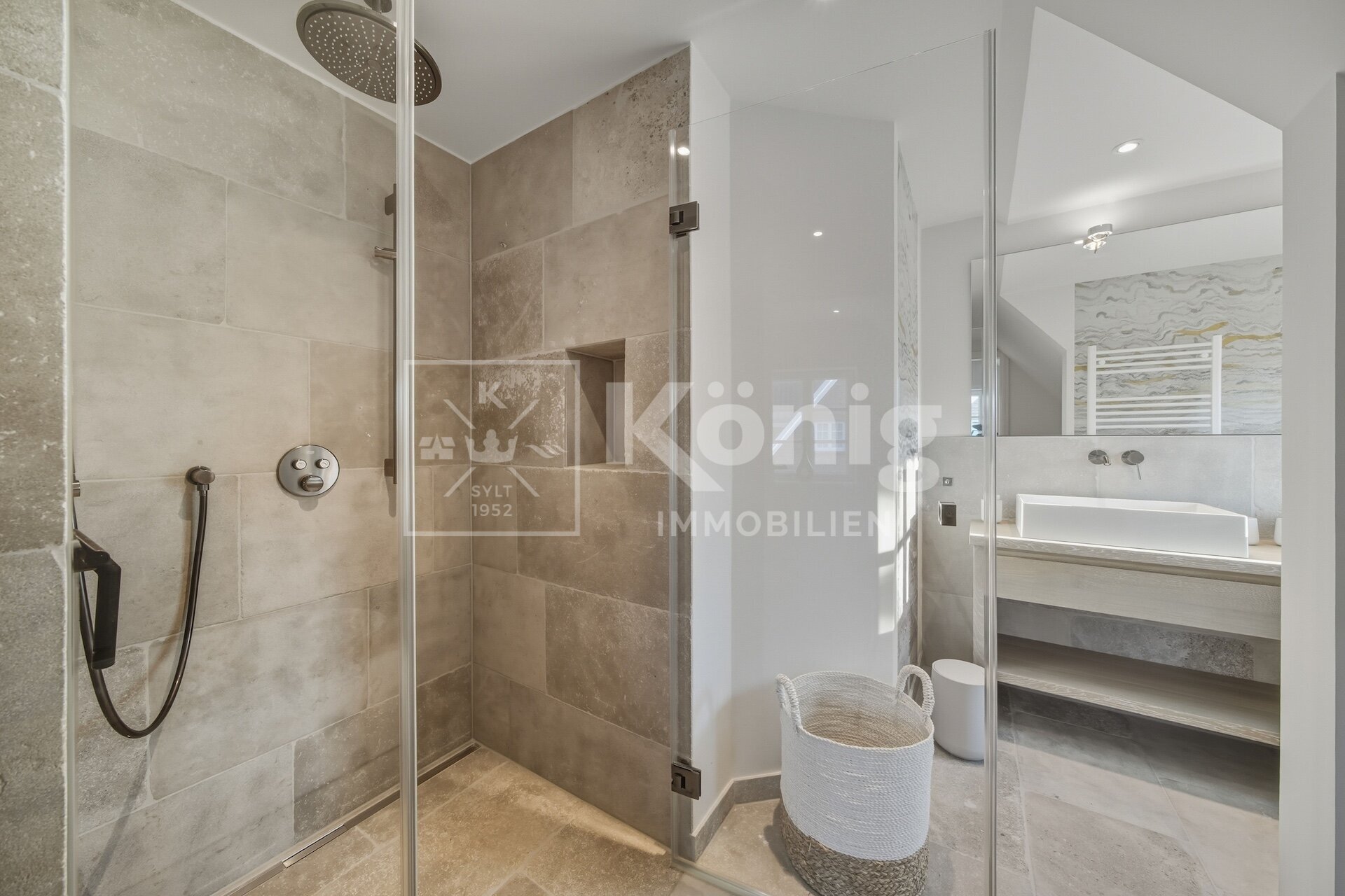 Eine durchdachte Raumaufteilung bietet insgesamt fünf Zimmer, darunter drei stilvolle Schlafzimmer und drei moderne, hochwertig ausgestattete Badezimmer. Ein besonderes Highlight ist das Schlafzimmer mit Bad en Suite im Erdgeschoss, das höchsten Komfort garantiert und bequem begehbar ist. Altersgerechtes und bequemes Wohnen auf einer Ebene ist hier möglich, dies ist auf Sylt nur sehr selten zu finden.