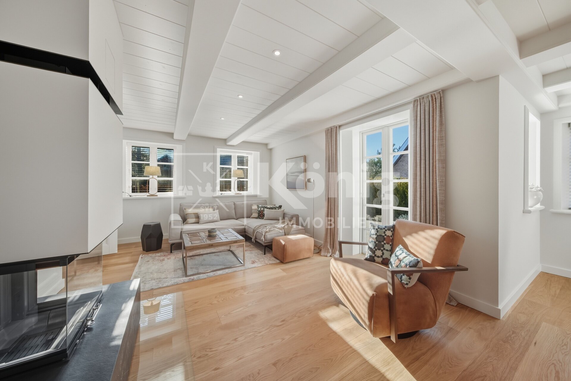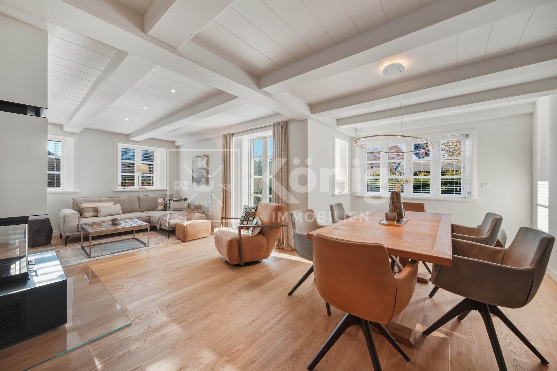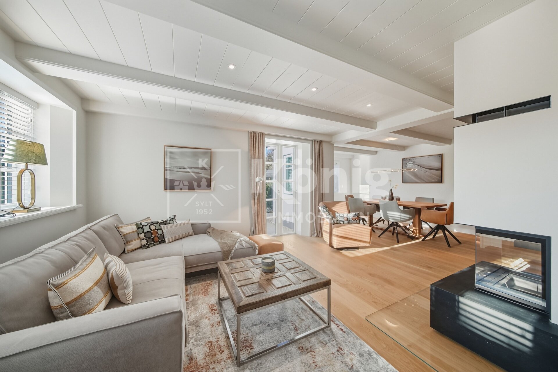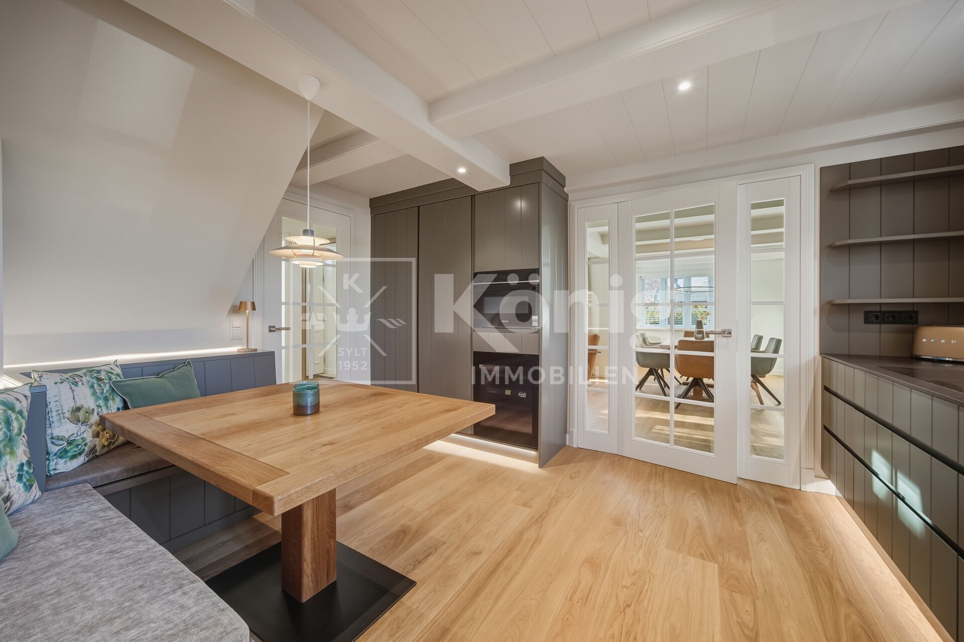 Der Wohnbereich ist das Herzstück der Immobilie, ausgestattet mit einem gemütllichen Echtholz-Kamin, der eine warme und einladende Atmosphäre schafft. Die maßgeschneiderte Tischlerküche mit Sitzbank, gefertigt von einem renommierten Sylter Tischlermeister, rundet das exklusive Wohngefühl ab.