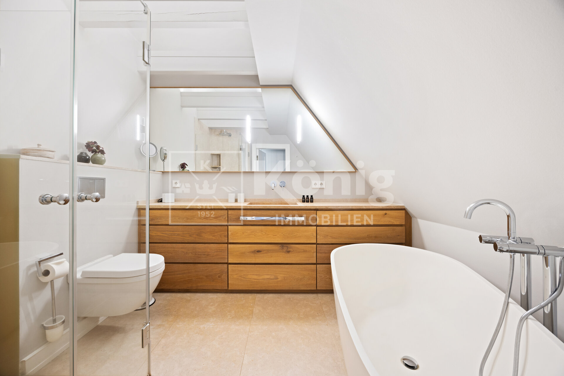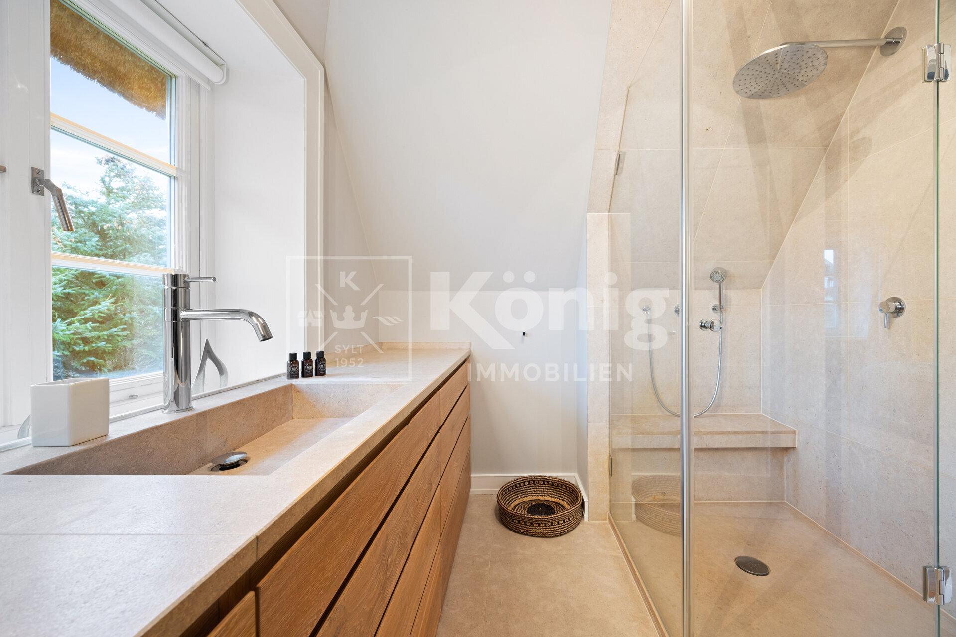 Über eine hochwertige, mit Bewegungsmeldern ausgestattete beleuchtete Treppe, gelangen Sie in das Dachgeschoss. Dort empfangen Sie zwei mit Liebe zum Detail eingerichtete Schlafräume die einen behaglichen Rückzugsbereich schaffen und mit einer sehr hohen Deckenhöhe beeindrucken. Die beiden hochwertigen Badezimmer, die an die Schlafbereiche angrenzen verfügen über individuelle, vom Tischler gefertigte Waschtische mit Natursteinplatten und Fußbodenheizung mit Raumthermostaten. Das eine Badezimmer verfügt über eine komfortable Badewanne und Dusche und das andere über eine Dusche mit gemauertem Sitz.