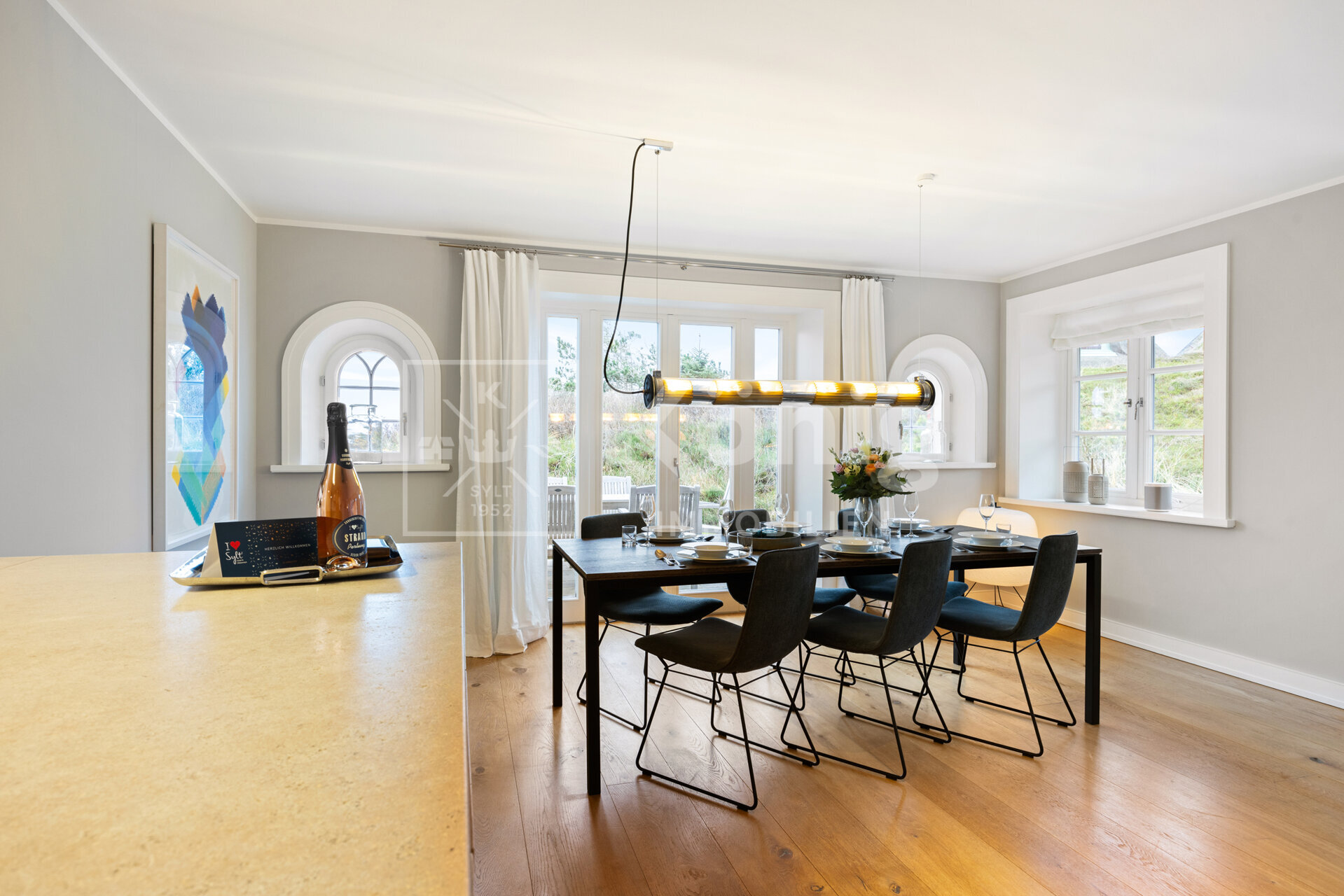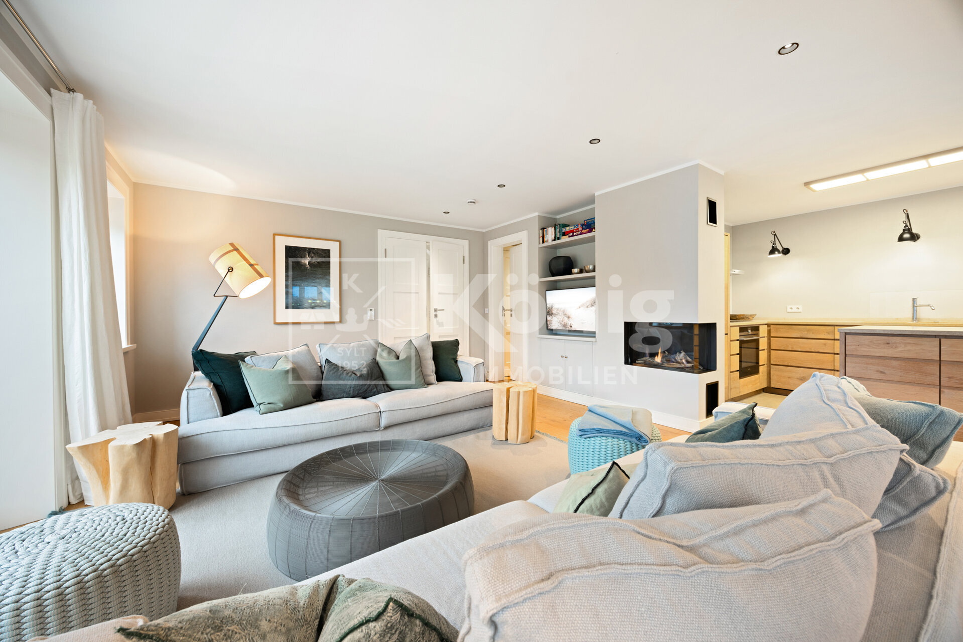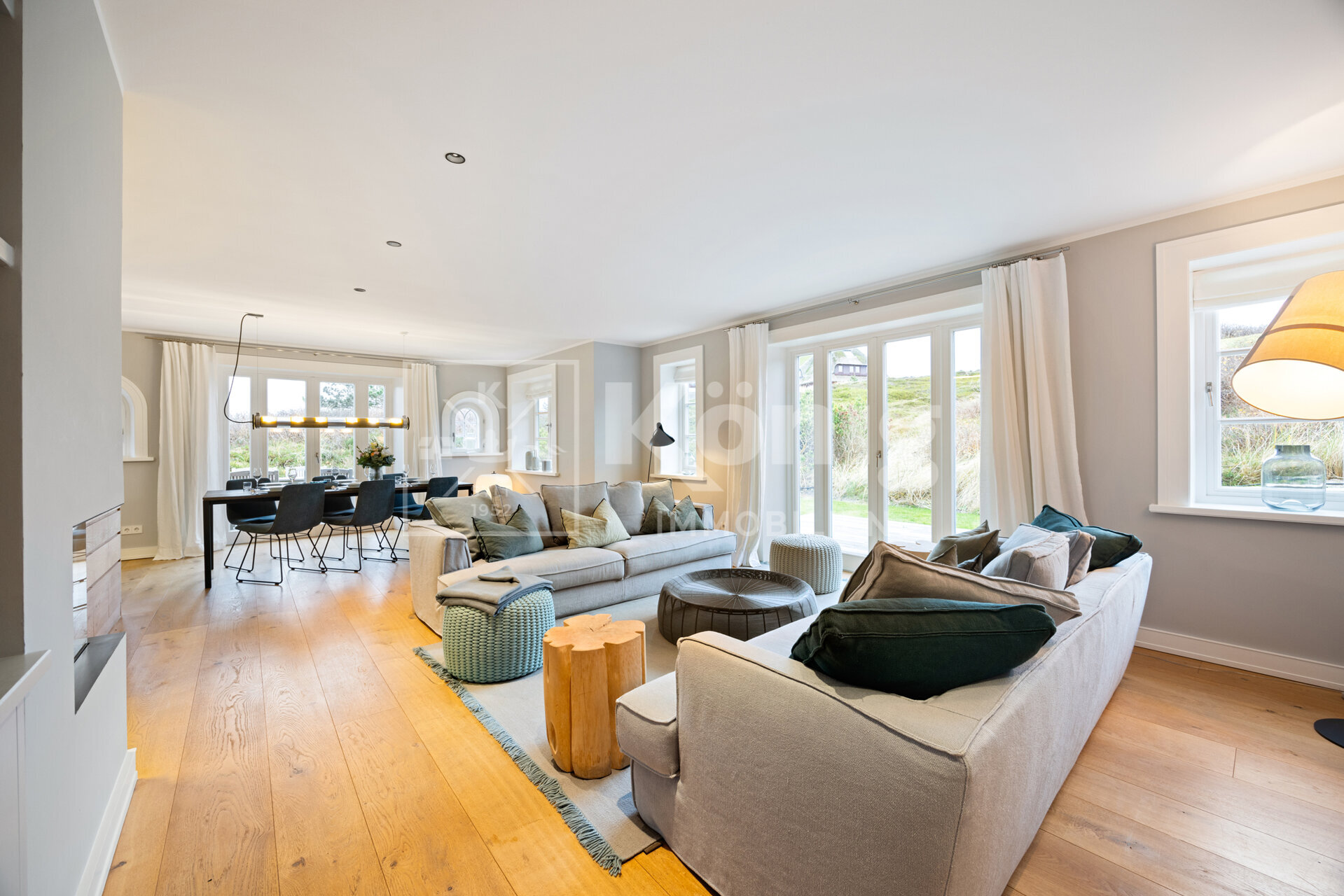 Das stilvoll und elegant eingerichtete Wohnzimmer sorgt mit einem bequemen Lounge-Sofa vor dem Gas-Kamin vom renommierten Hersteller Kal-Fire für eine einladende Atmosphäre. Es ist ebenso lichtdurchflutet, wie durchdacht designt. Der weitläufige Essbereich eignet sich hervorragend für gesellige Runden mit Freunden und Familie und gewährt einen unmittelbaren Zugang zur Südterrasse, welche mit ihrem Ausblick auf das Wattenmeer ein Highlight der Immobilie ist. Die großzügig stylische Küche, ausgestattet mit hochwertigen Siemens-Geräten, lässt keine Wünsche offen und verwandelt das Kochen in ein pures Vergnügen. Ein Gäste-WC steht im EG ebenfalls zur Verfügung.