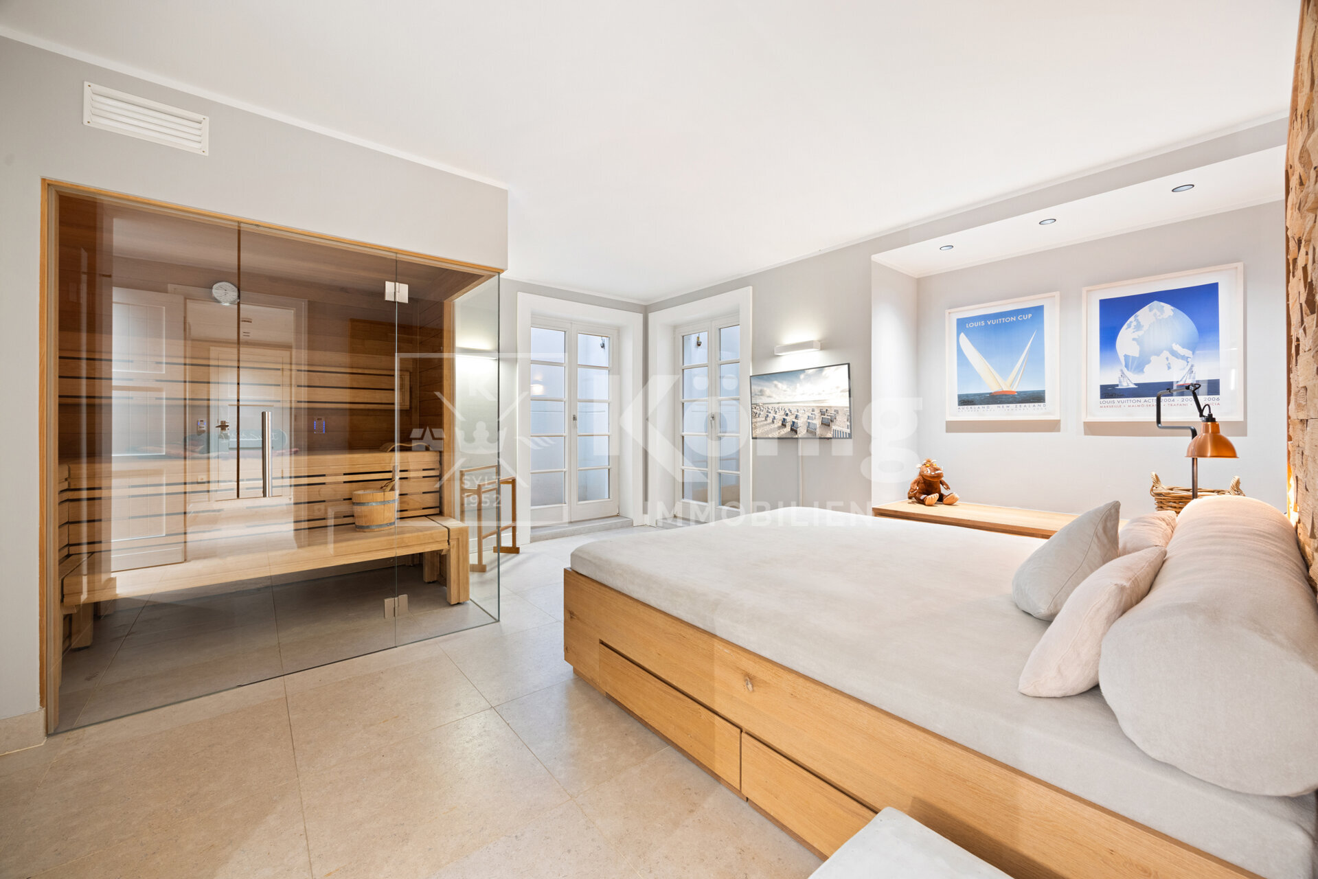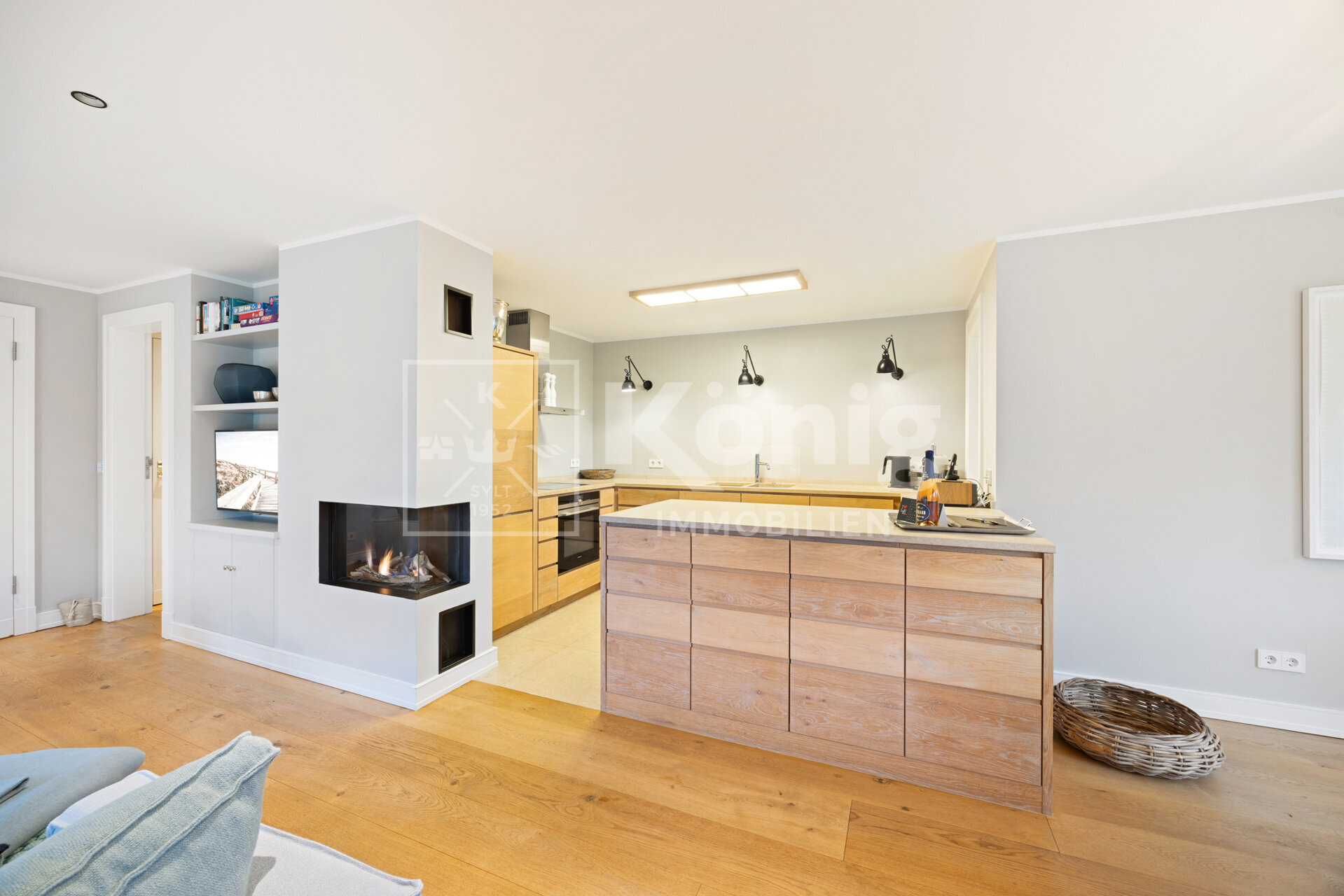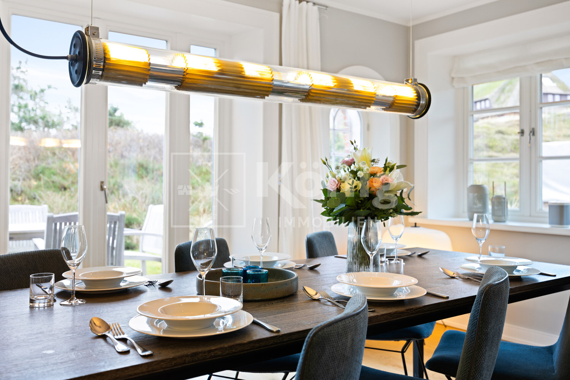 Das stilvoll und elegant eingerichtete Wohnzimmer sorgt mit einem bequemen Lounge-Sofa vor dem Gas-Kamin vom renommierten Hersteller Kal-Fire für eine einladende Atmosphäre. Es ist ebenso lichtdurchflutet, wie durchdacht designt. Der weitläufige Essbereich eignet sich hervorragend für gesellige Runden mit Freunden und Familie und gewährt einen unmittelbaren Zugang zur Südterrasse, welche mit ihrem Ausblick auf das Wattenmeer ein Highlight der Immobilie ist. Die großzügig stylische Küche, ausgestattet mit hochwertigen Siemens-Geräten, lässt keine Wünsche offen und verwandelt das Kochen in ein pures Vergnügen. Ein Gäste-WC steht im EG ebenfalls zur Verfügung.