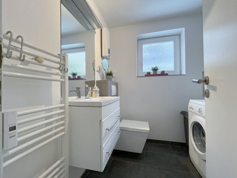 Jeder Raum mit Fenster, dadurch sehr hell und freundlich, zwei Waschmaschinenanschlüsse, geschützte, große Süd-/Westterrasse mit Blick in den herrlich begrünten, eingewachsenen Garten. Eigenes Grundbuchblatt, eigener Kellerabstellverschlag, eigener Pkw-Außenstellplatz auf dem Grundstück, gemeinschaftlicher Wasch-/Trockenraum und Fahrradabstellplatz, Gartenhaus.