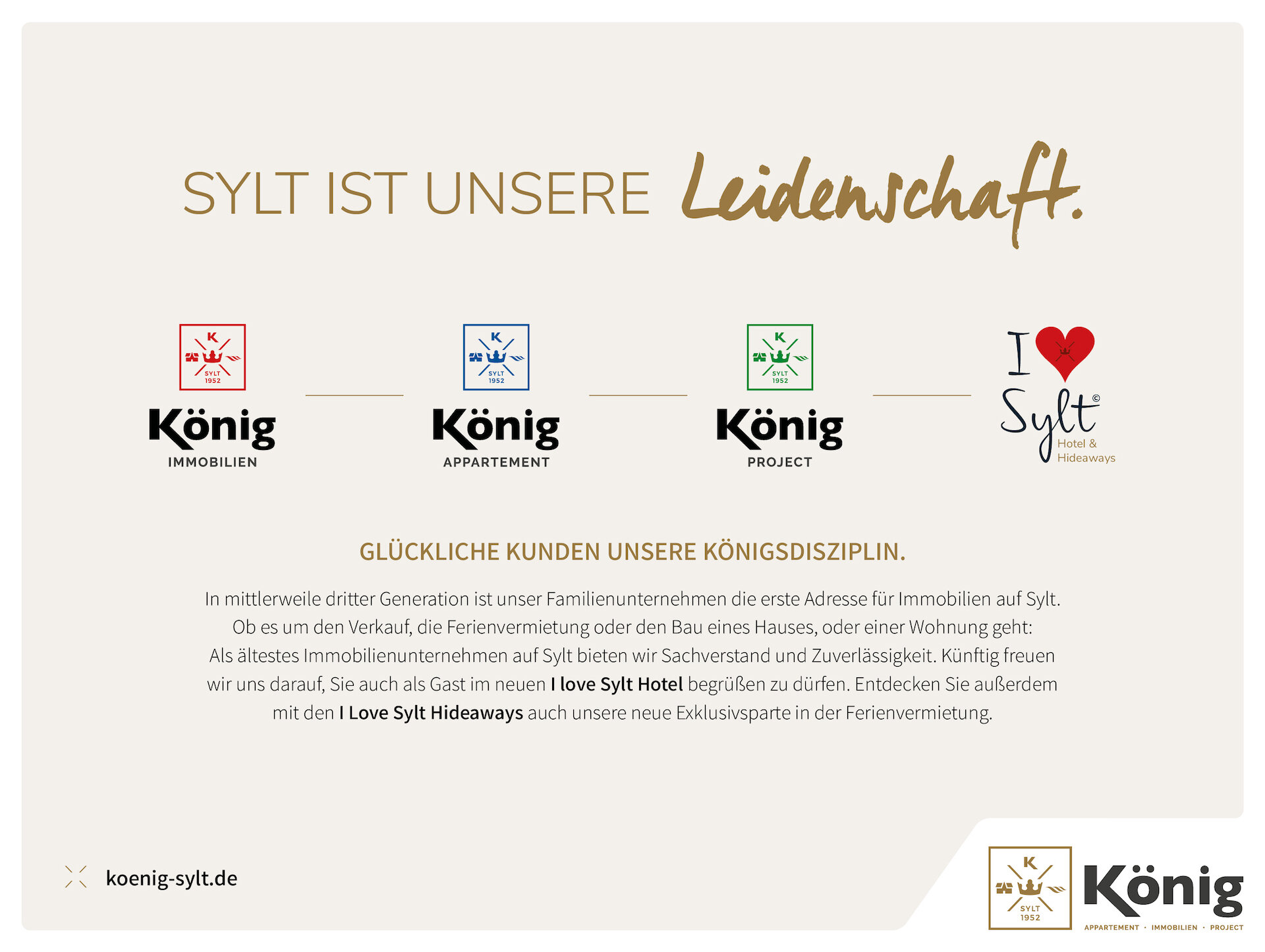 Die Gesamtfläche umfasst Wohn- und Nutzflächen und basiert auf dem „Sylter Maß“. Gemessen werden alle Flächen an den Fußleisten (Erd-, Dach- und Untergeschoss sowie Spitzboden), Terrassen und Freisitze werden zu 100 % angerechnet. Die Angaben des Exposés und die Flächenangaben beruhen auf Angaben der Eigentümerseite.