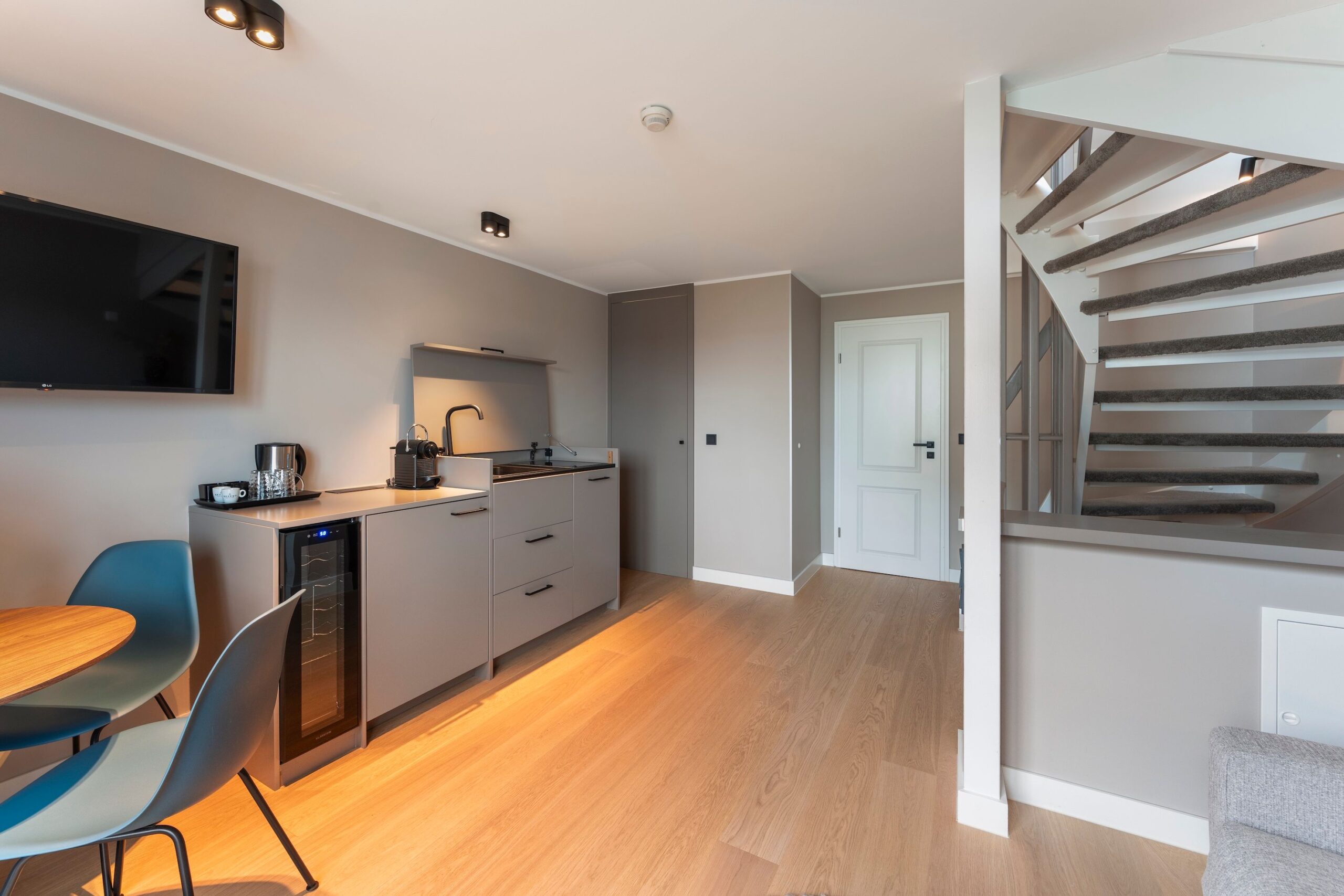 Die offene Pantry-Küche ist funktional und hochwertig ausgestattet – mit Induktionskochfeld, Kühlschrank mit Gefrierfach, Geschirrspüler, Weinkühlschrank und Nespresso-Kaffeemaschine. Perfekt für ein schnelles Frühstück oder kleine Mahlzeiten im Urlaub – ganz ohne Stress.