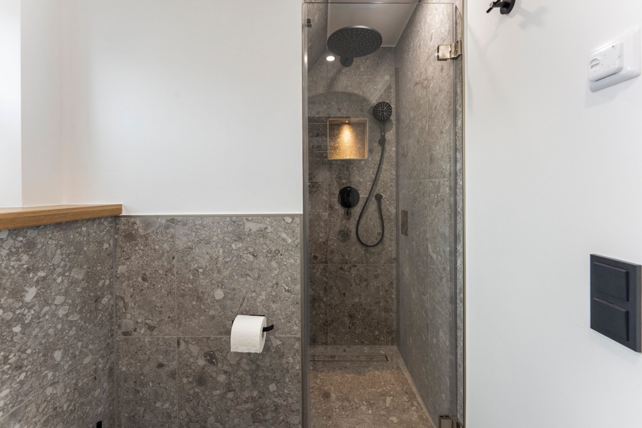 Das geräumige Badezimmer mit Dusche bietet Ihnen alles, was Sie für einen angenehmen Start in den Tag oder entspannte Momente am Abend benötigen.