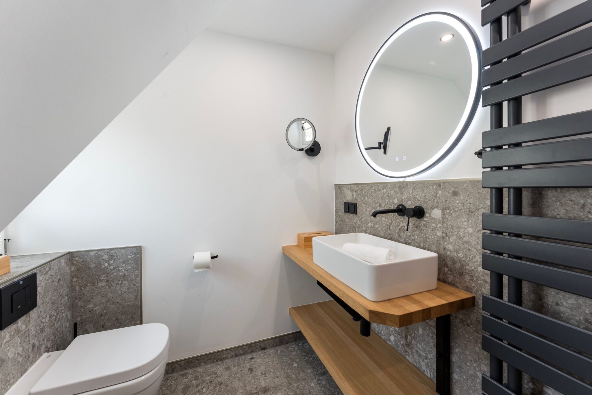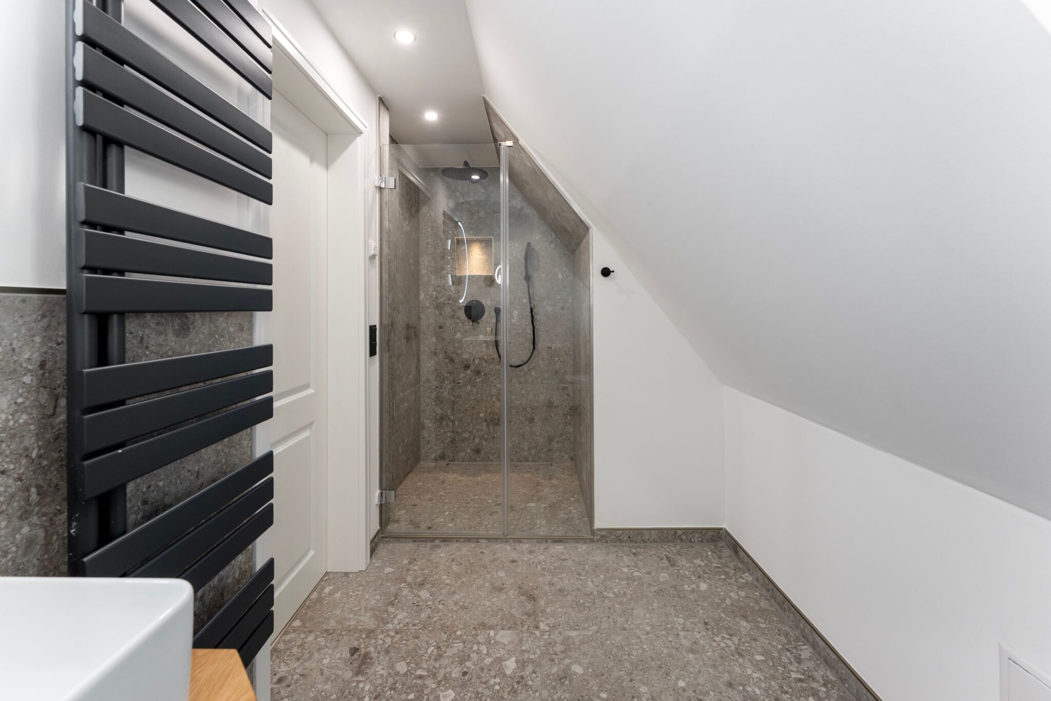 Das Schlafzimmer mit komfortablem Doppelbett (160x200 cm) ist eine kleine Wohlfühloase. Die geschmackvolle Einrichtung sorgt für eine angenehme Nachtruhe. Im angrenzenden, geräumigen Badezimmer mit moderner Dusche starten Sie erfrischt und energiegeladen in den Tag.