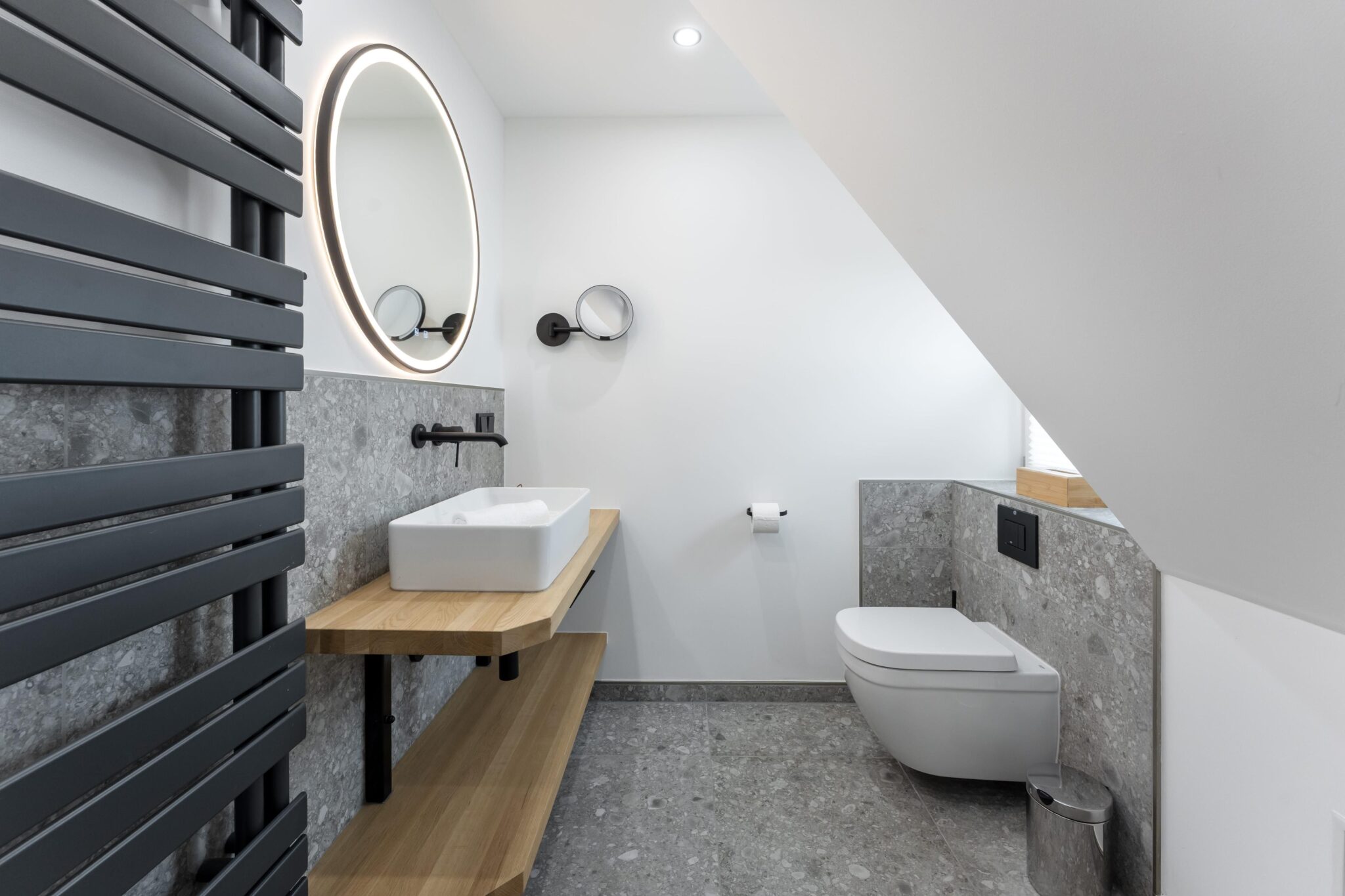 Das geräumige Badezimmer mit Dusche ist modern gestaltet und bietet alles für einen erfrischenden Start in den Tag.