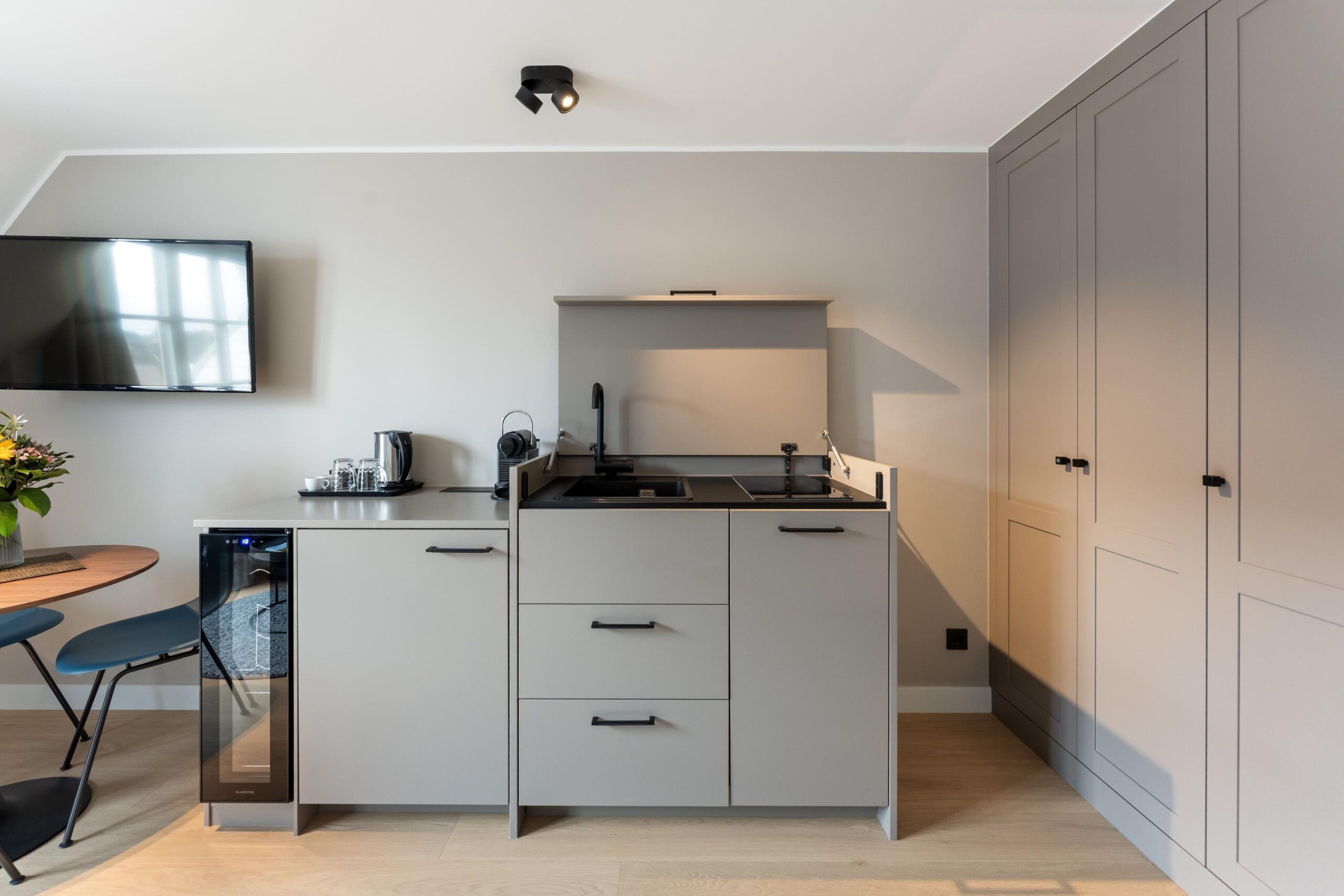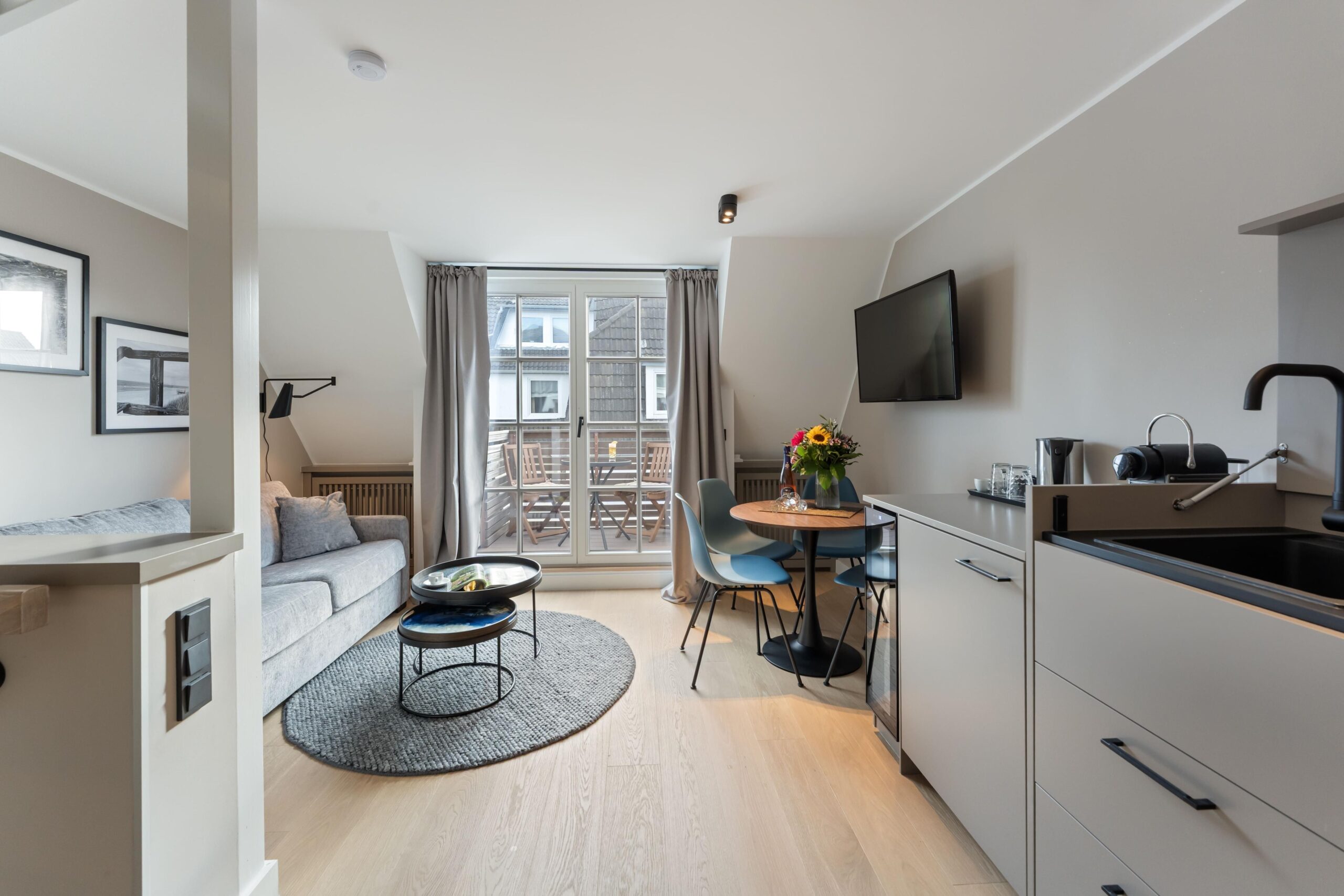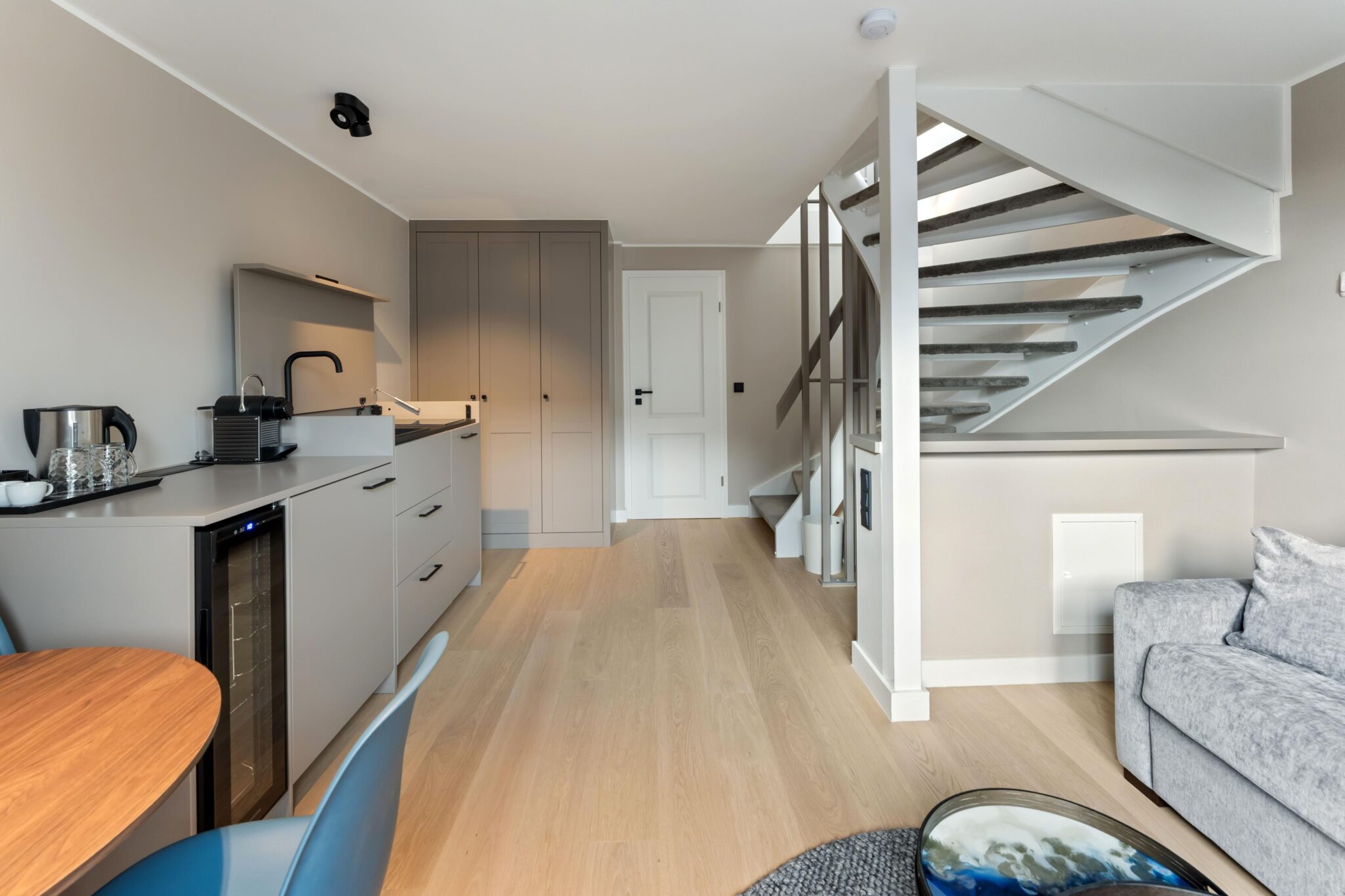 Im offen gestalteten Wohnbereich erwartet Sie eine entspannte Atmosphäre mit bequemer Schlafcouch (140x200 cm) und Flat-TV. Die harmonisch integrierte Pantry-Küche ist perfekt für kleine Mahlzeiten oder ein ausgiebiges Frühstück. Ausgestattet mit Induktionskochfeld, Weinkühlschrank, Geschirrspüler, Kühlschrank mit Gefrierfach und Nespresso-Maschine lässt sie keine Wünsche offen.