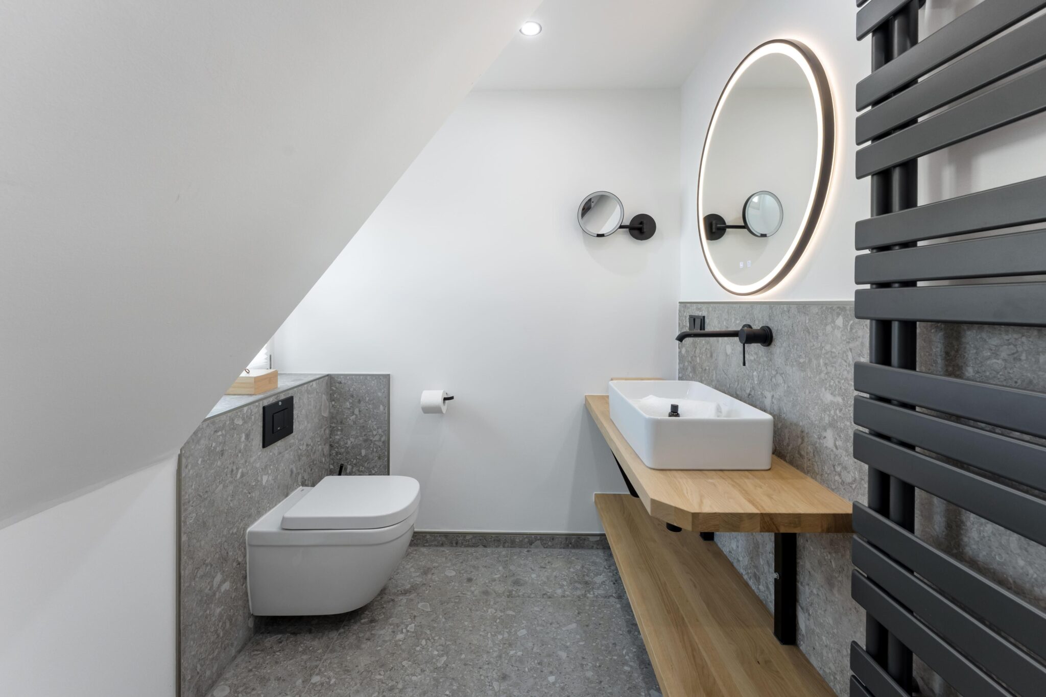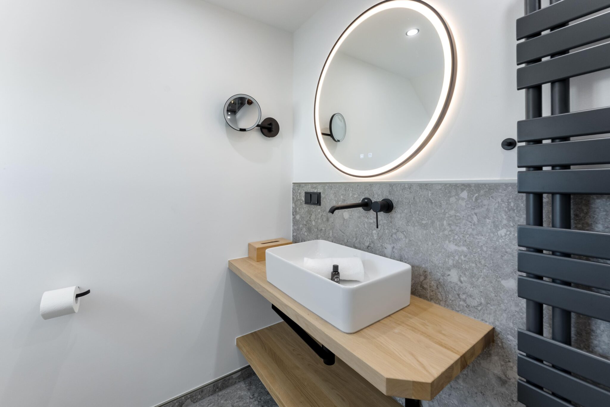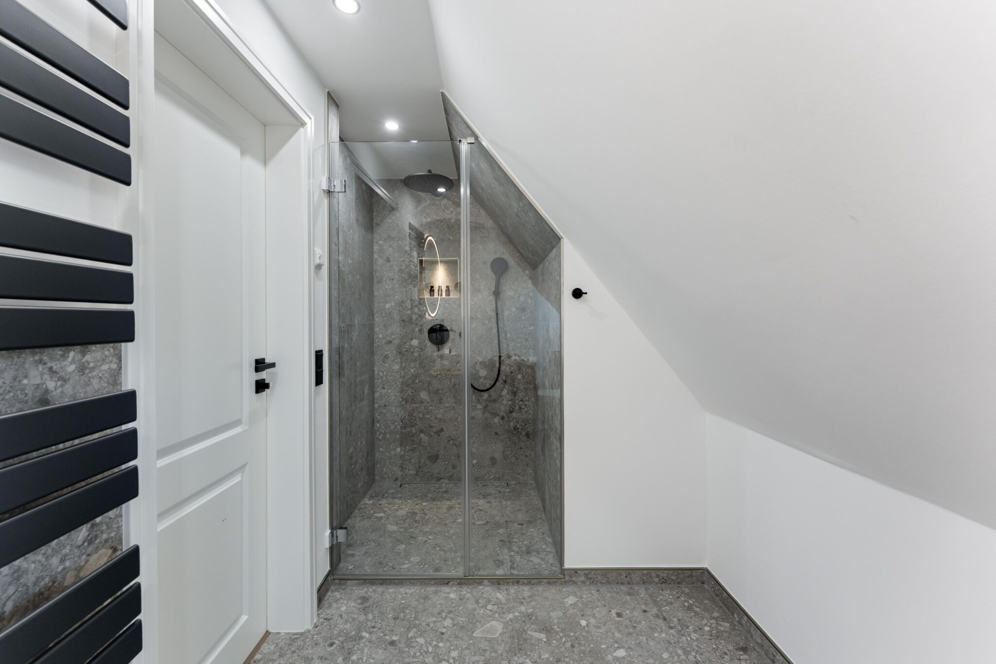 Das geräumige Badezimmer mit Dusche ist modern gestaltet und bietet alles für einen erfrischenden Start in den Tag.