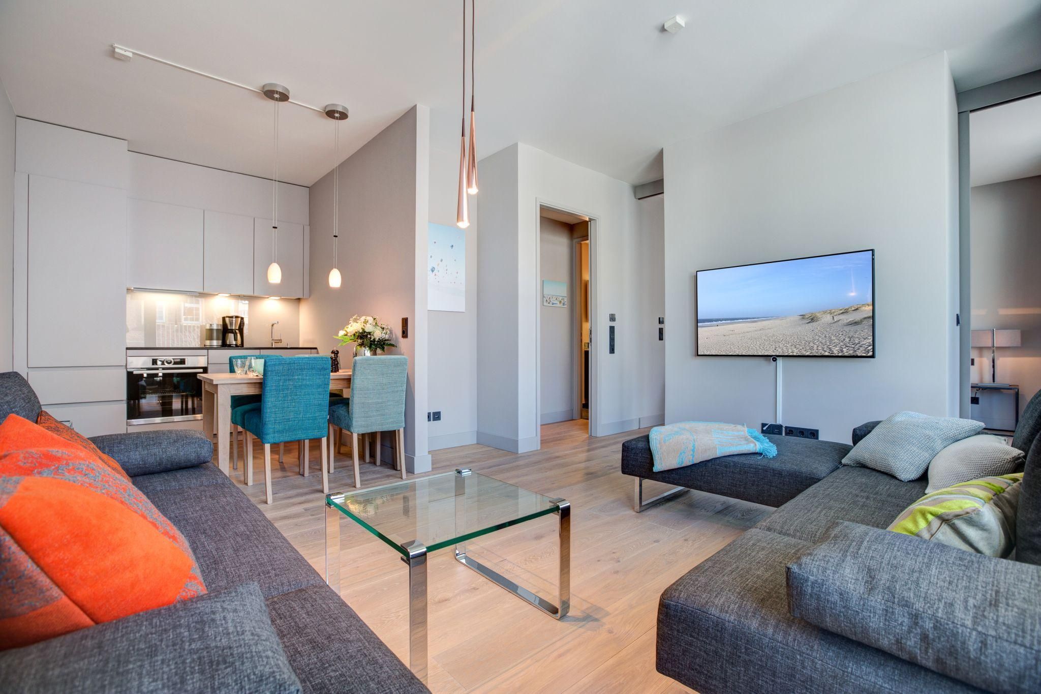 Stil-Liebhaber, erleben Sie modernes Wohnen in der lichtdurchfluteten 'Neuen Mitte'! Diese exklusive Ferienwohnung beeindruckt mit ihrem durchdachten Raumkonzept und bodentiefen Fenstern, die den Übergang zur großen West-Dachterrasse nahtlos gestalten. Hier genießen Sie Sonnenuntergänge auf luxuriösen Liegen, während der elegante Wohnbereich zum Verweilen einlädt. Modern, apart und nur einen Sprung vom Strand entfernt – Ihr stilvolles Refugium auf Sylt!
